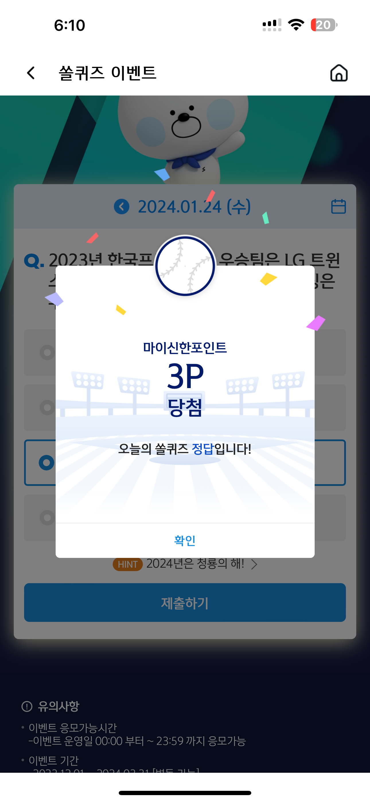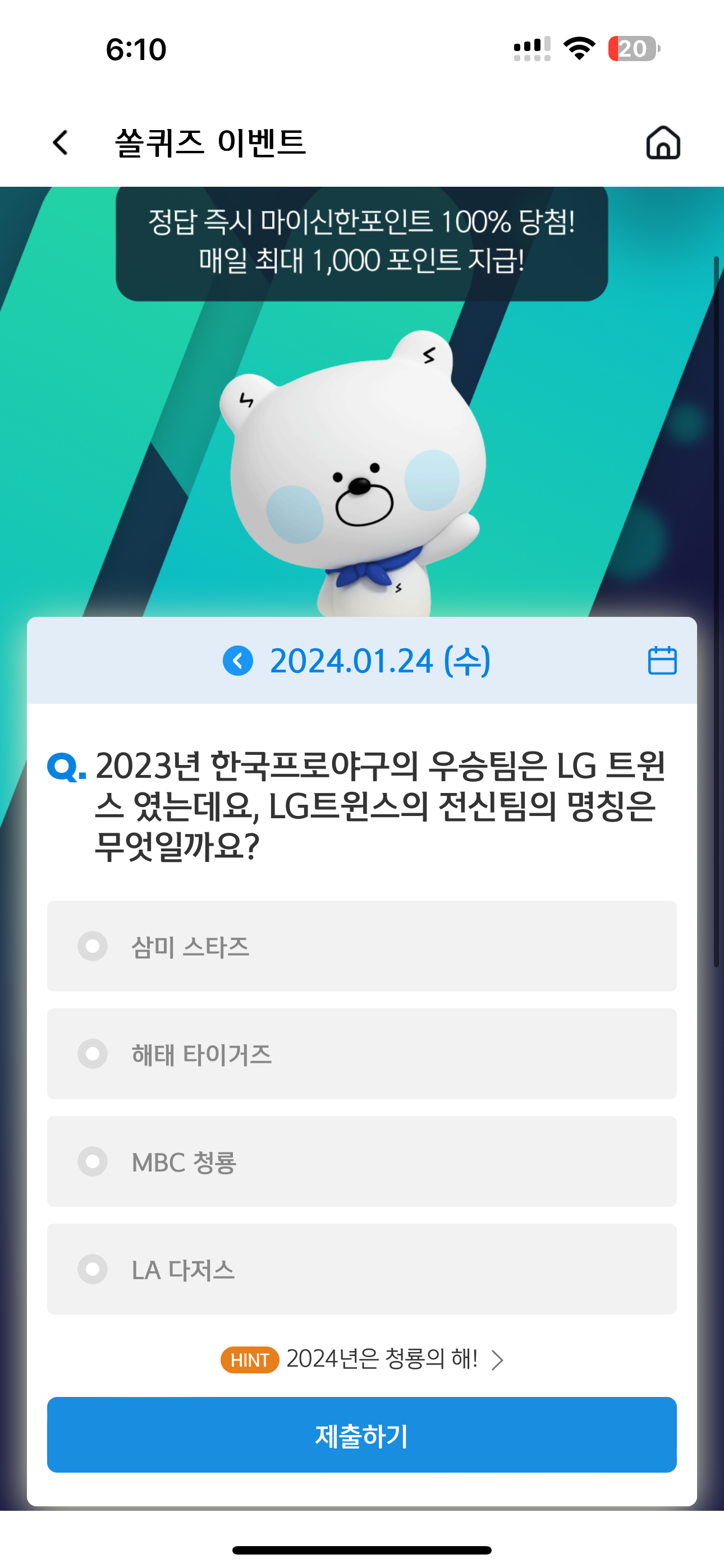 신한 슈퍼SOL 야구/상식 쏠퀴즈 1월 24일 문제입니다