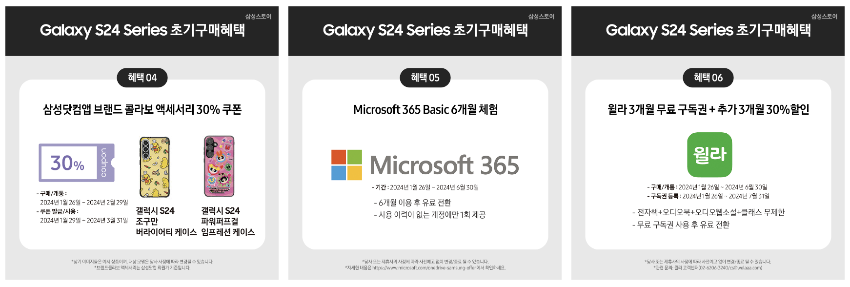 *위 혜택별 자세한 신청기간 및 신청방법 등 유의사항은 삼성닷컴(https://www.samsung.com/sec/event/galaxy-s24/promotion)에서 확인 가능합니다.