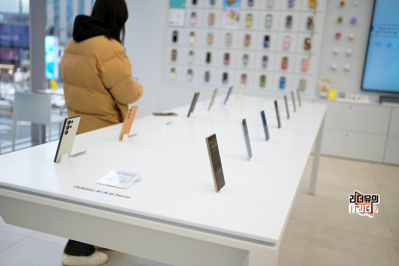 삼성스토어 강남 1층에는 갤럭시S24 시리즈를 자유롭게 체험해 볼 수 있는 공간이 마련되어 있습니다. 그리고 삼성스토어 강남에서만 볼 수 있는 갤럭시S24 삼성 강남 전용 색상이 전시되어 있어 눈길을 사로 잡습니다.