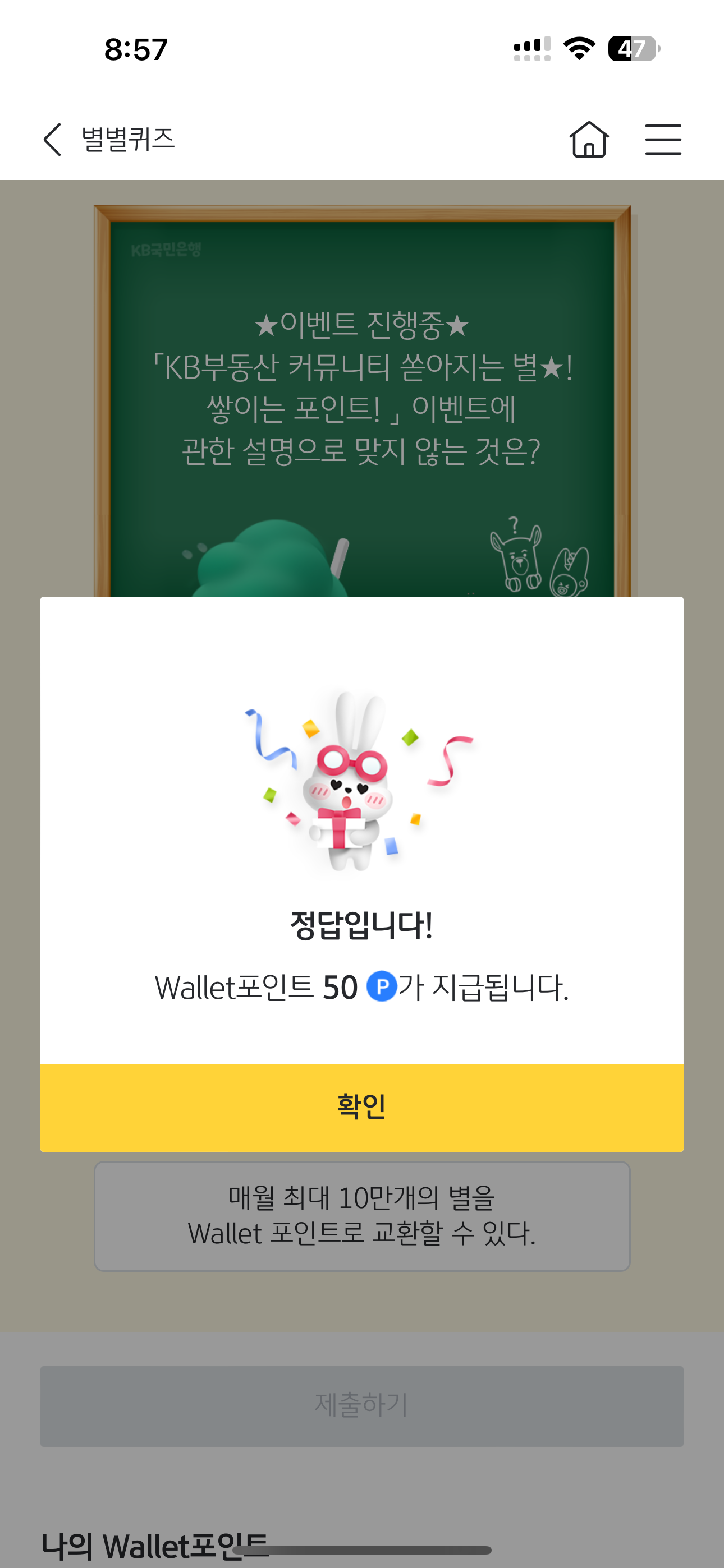Wallet포인트 50포인트를 받았습니다. 월렛 포인트는 현금 전환이 가능하니 꼭 받으시고요. 여러분의 재테크를 응원합니다