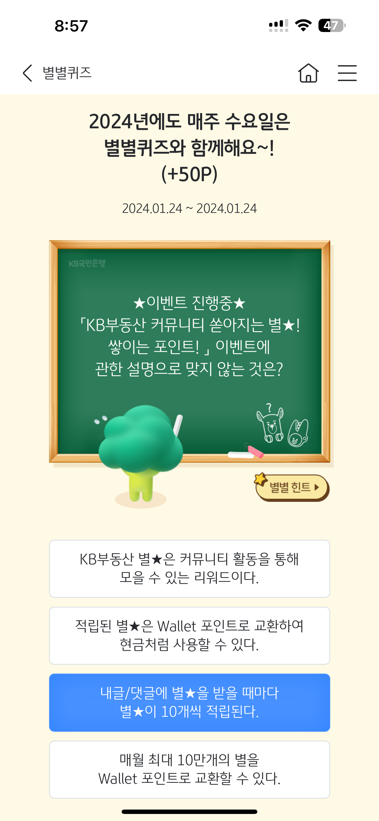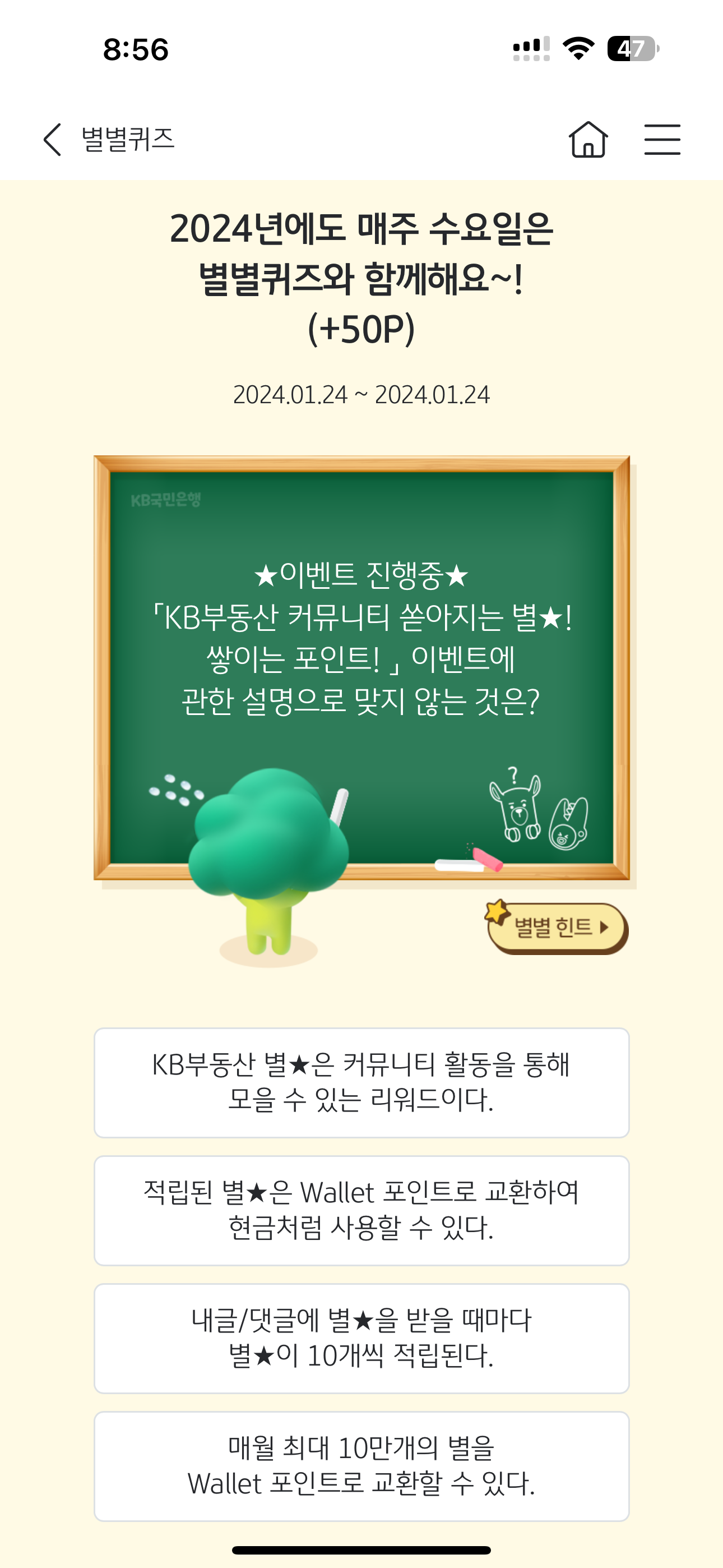 KB스타뱅킹 별별퀴즈 1월 24일 정답(KB부동산 커뮤니티 쏟아지는 별 쌓이는 포인트! 이벤트에 관한 설명으로 맞지 않는 것은?)