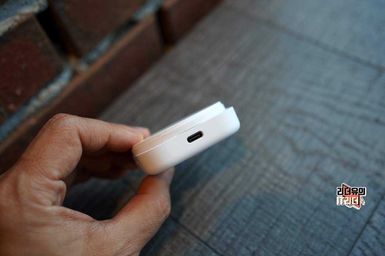 그리고 옆면에는 충전 케이블을 연결할 수 있는 USB-C 단자가 있습니다. 참고로 보기에는 보조배터리처럼 생겼지만 유선으로 연결해서 사용하는 맥세이프 충전기입니다. 자체 충전 기능은 없습니다.