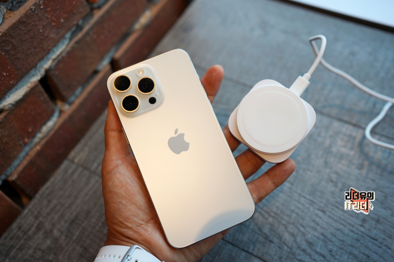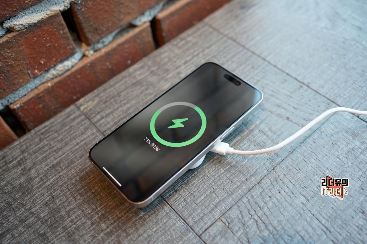 아이폰15 프로 맥스를 충전하는 모습입니다. 맥세이프 충전 표시 잘 뜨고 충전 속도도 15W를 지원해 빠르게 충전됩니다. 어디서나 간편하게 충전이 가능해서 좋습니다.