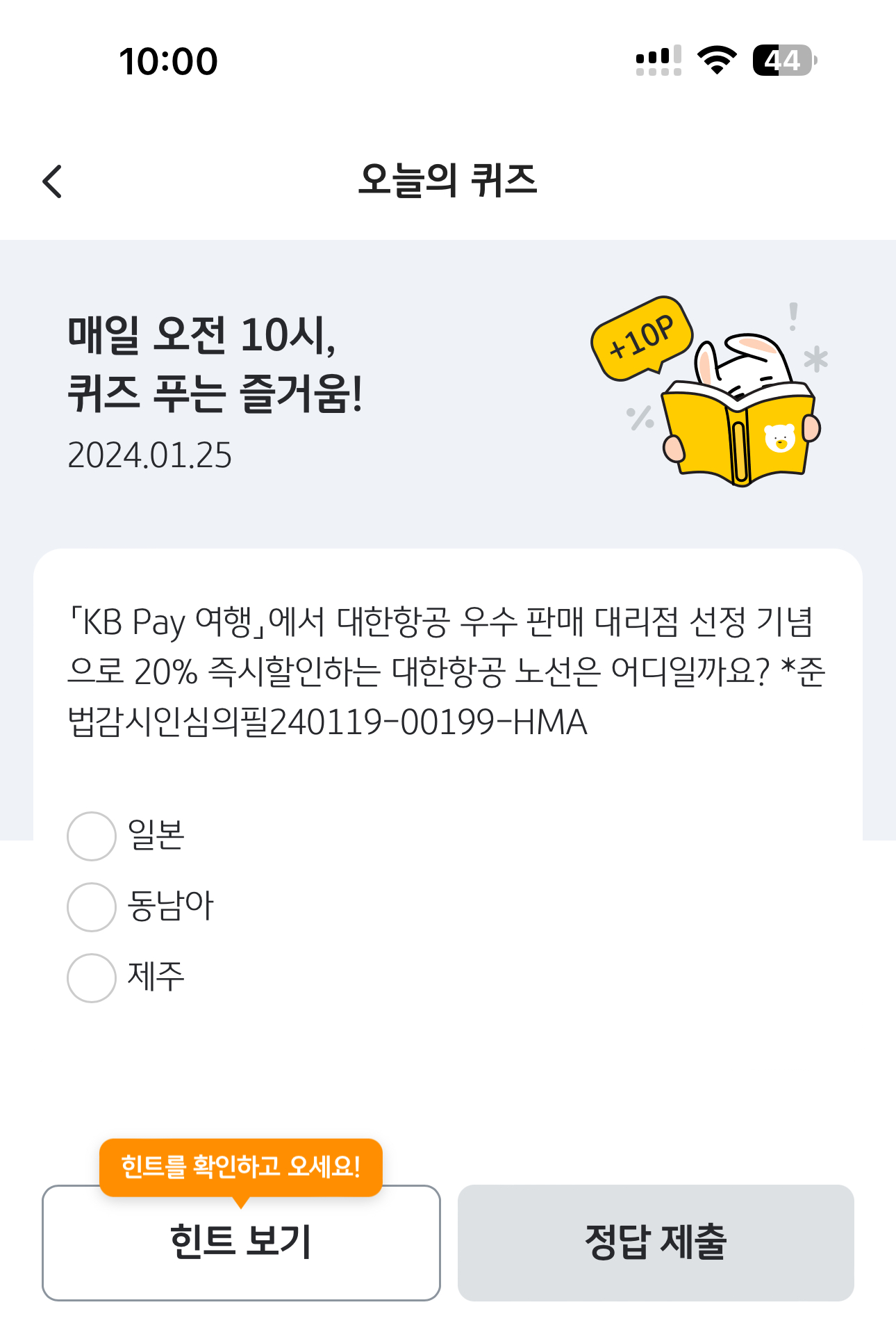 「KB Pay 여행」에서 대한항공 우수 판매 대리점 선정 기념으로 20% 즉시할인하는 대한항공 노선은 어디일까요? *준법감시인심의필240119-00199-HMA 보기는 1. 일본 2. 동남아 3. 제주 입니다. 추운 겨울에는 이곳으로 많이 간다고 하는데요. KB Pay 오늘의 퀴즈 정답은 동남아 입니다.