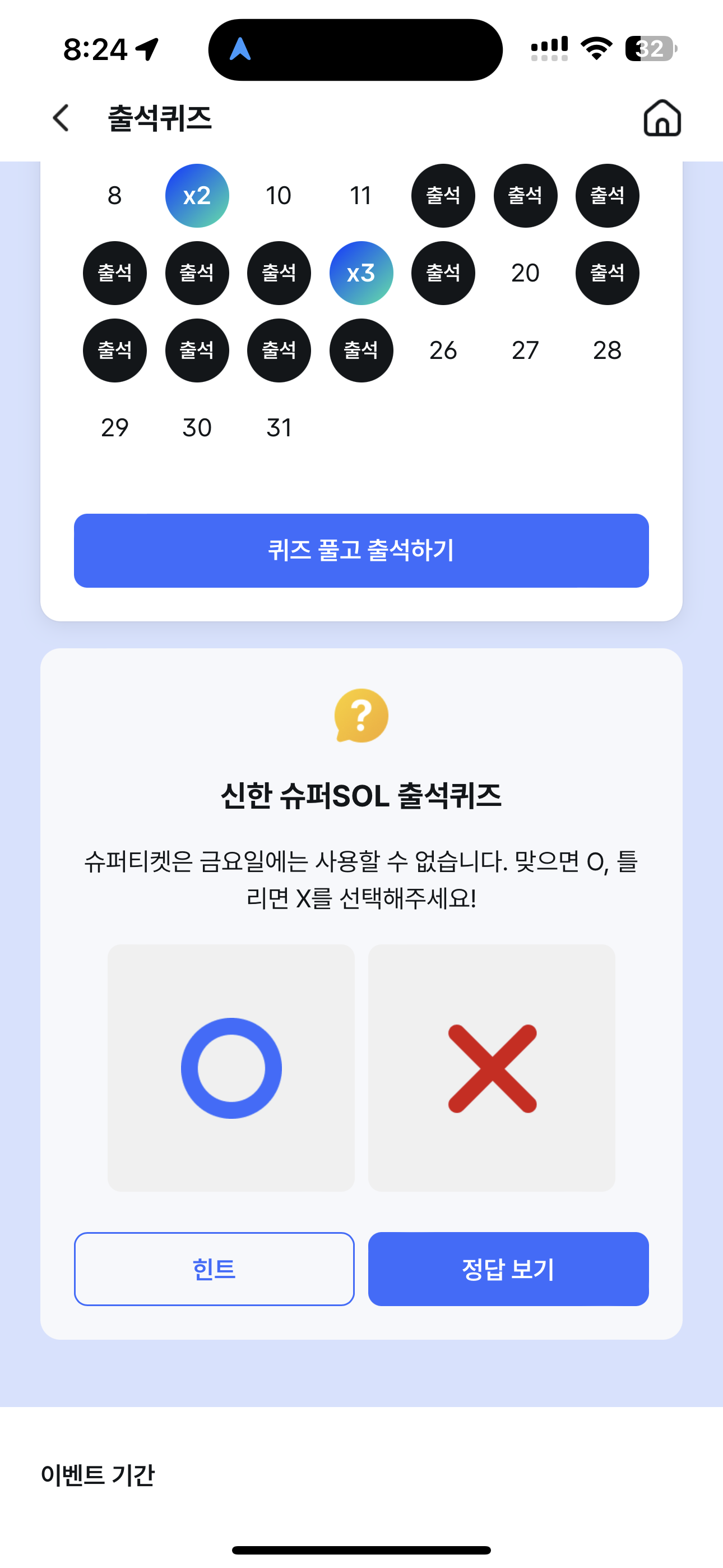 신한 슈퍼SOL 출석퀴즈 슈퍼티켓은 금요일에는 사용할 수 없습니다. 맞으면 O, 틀리면 X를 선택해주세요! O,X 퀴즈인데요.