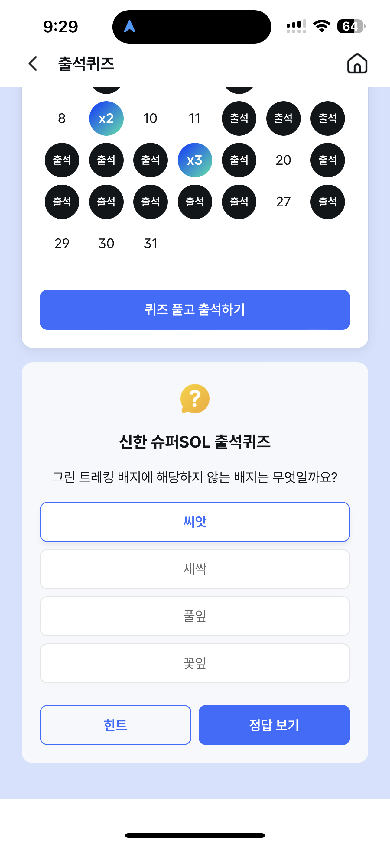 신한 슈퍼SOL 출석퀴즈 정답은 씨앗 입니다