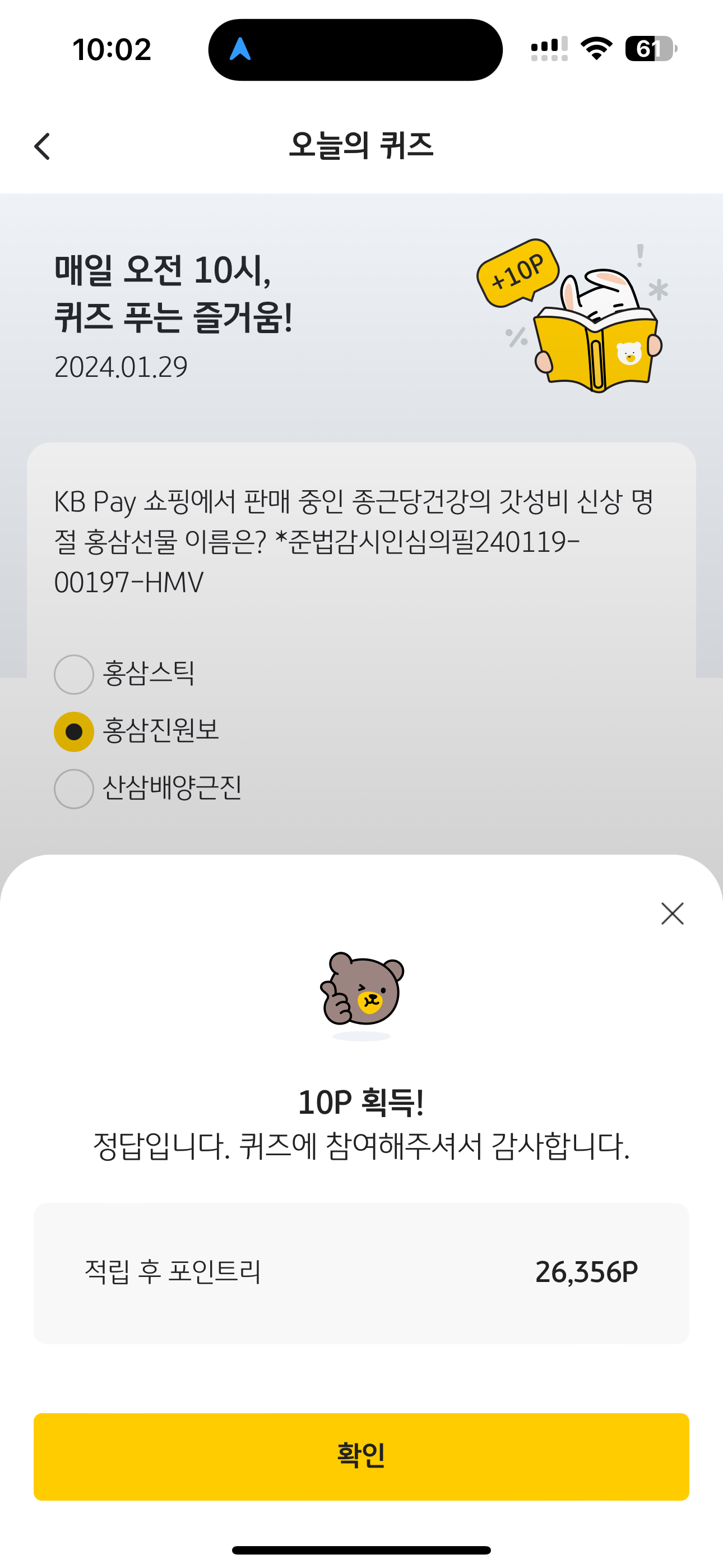 KB Pay 오늘의 퀴즈 정답은 홍삼진원보 입니다
