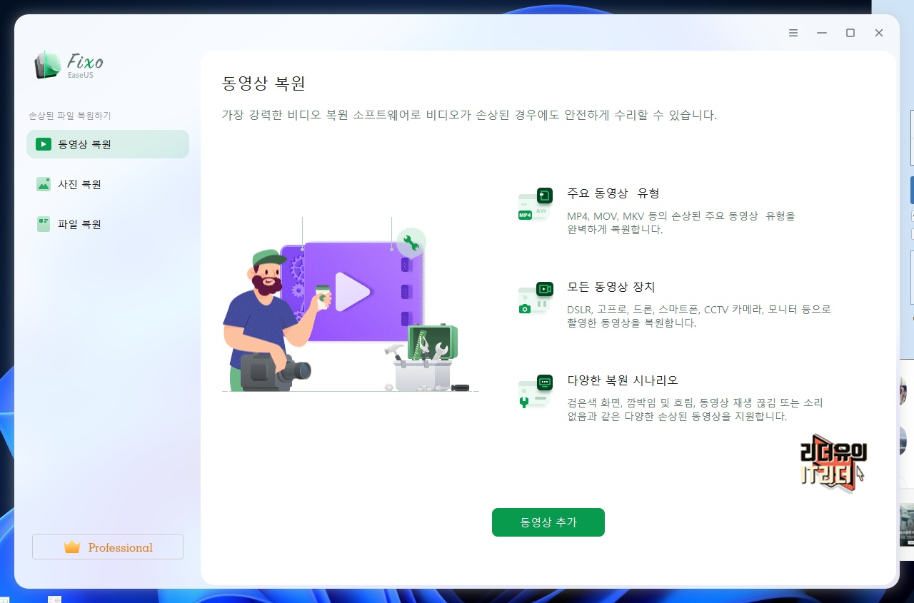 이지어스 EaseUS Fixo 프로그램이 실행된 모습입니다. 왼쪽에는 직관적으로 동영상 복원, 사진 복원, 파일 복원 메뉴를 가지고 있습니다. 동영상 복원의 경우 MP4, MOV, MKV 등 손상된 주요 동영상 유형을 완벽하게 복원한다고 안내되어 있습니다. 그리고 모든 동영상 장치를 지원하고 다양한 복원 시나리오로 손상된 동영상을 복구하게 됩니다.