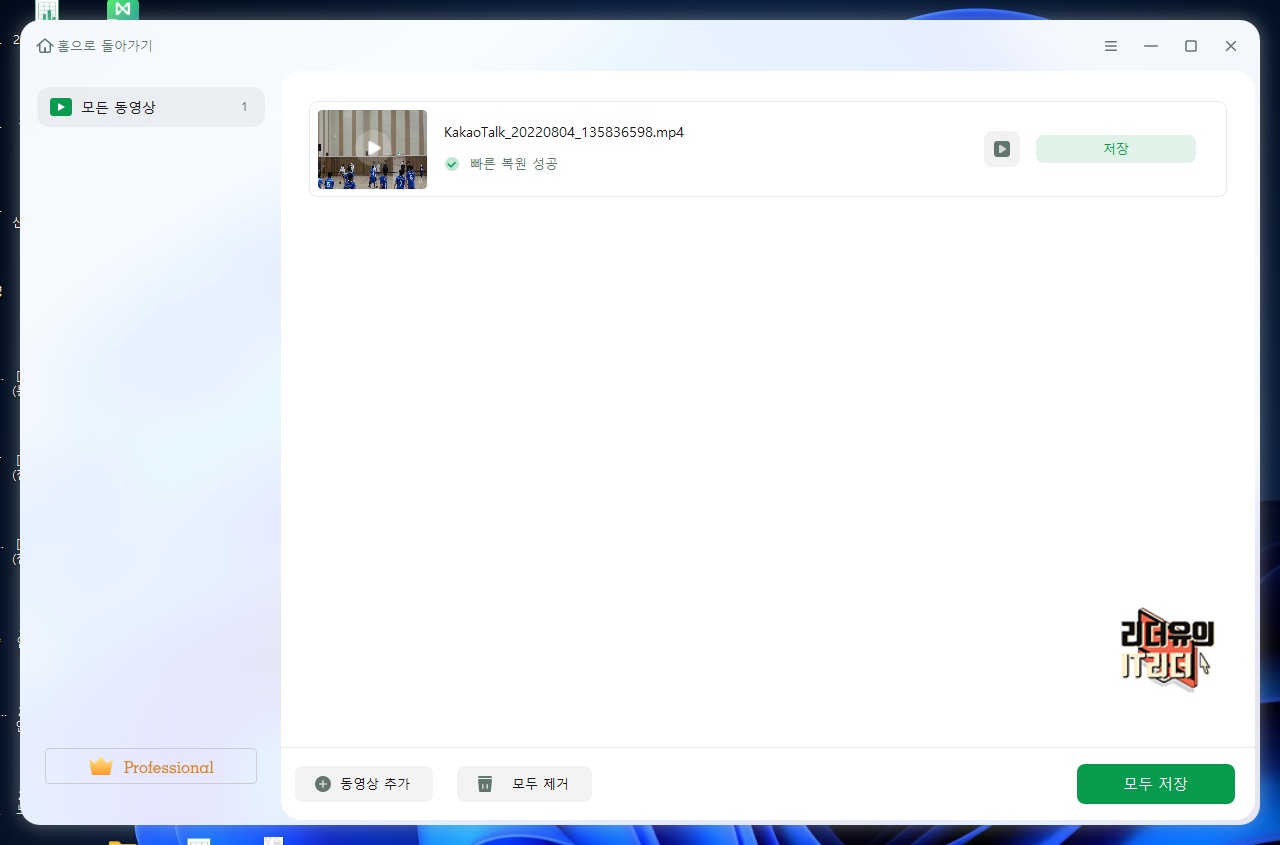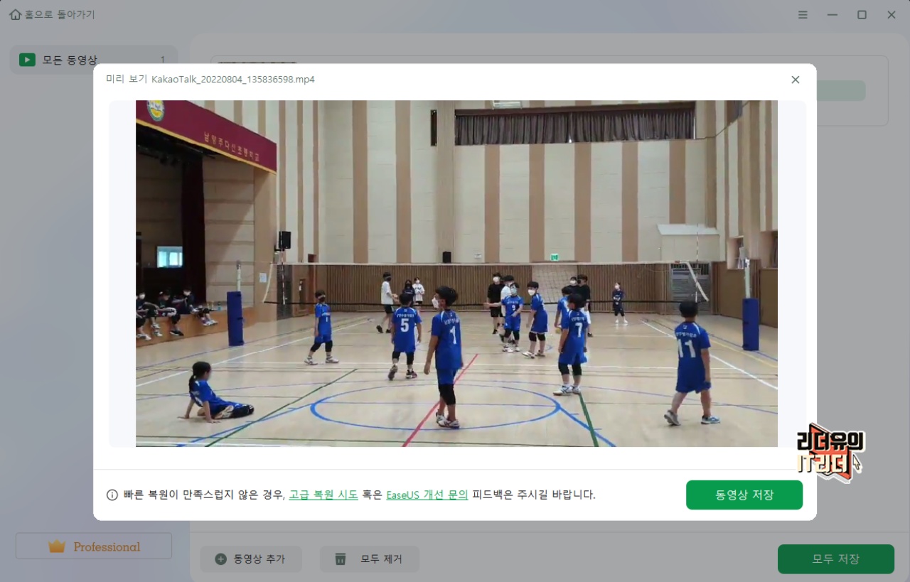 영상은 바로 재생도 가능해 제대로 복구가 되었는지 확인이 가능합니다. 빠른 복원이 만족스럽지 않은 경우는 고급 복원 시도로 조금 더 정교하게 동영상 복원에 들어갈 수 있습니다.
