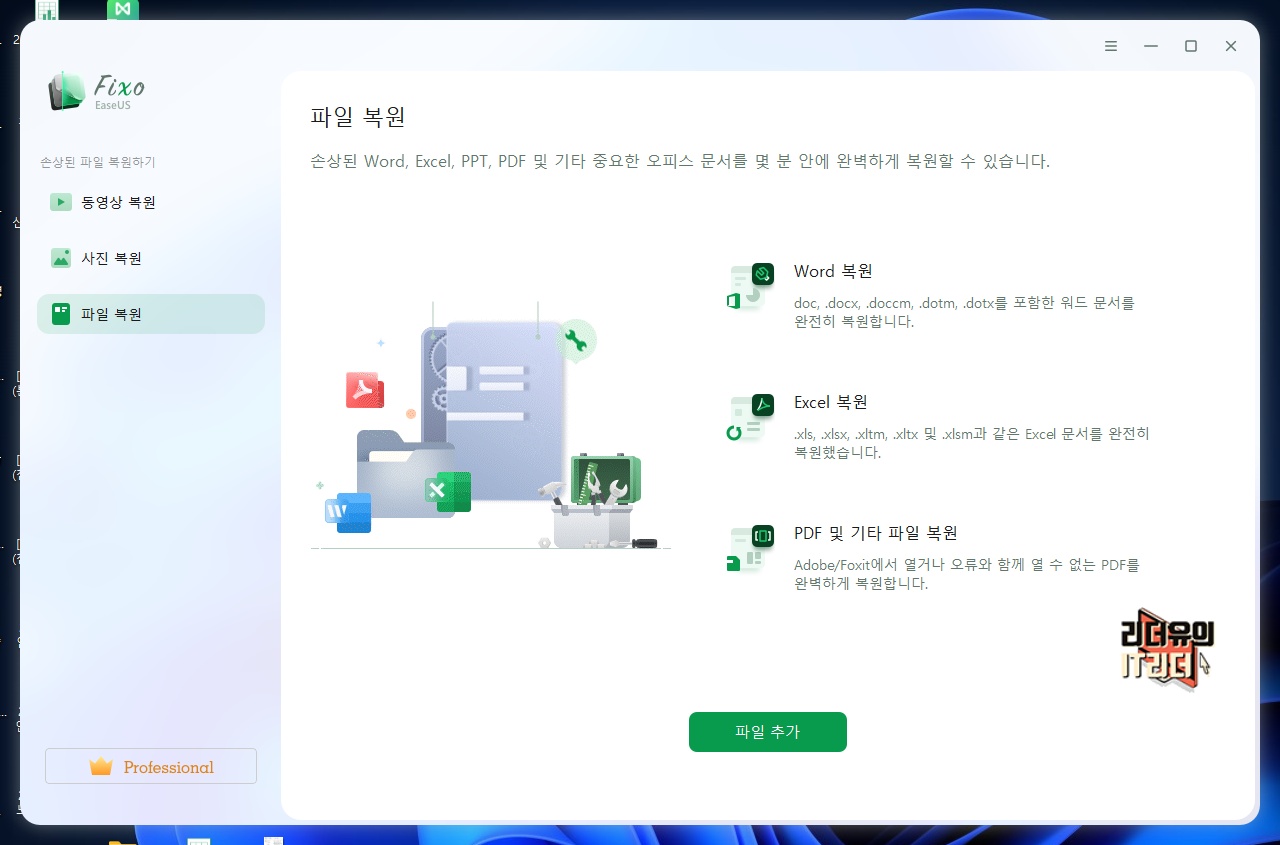 그리고 파일 복원도 가능합니다. 워드, 엑셀, PDF 및 기타 파일에 문제가 생겼을 경우 복원을 지원합니다.