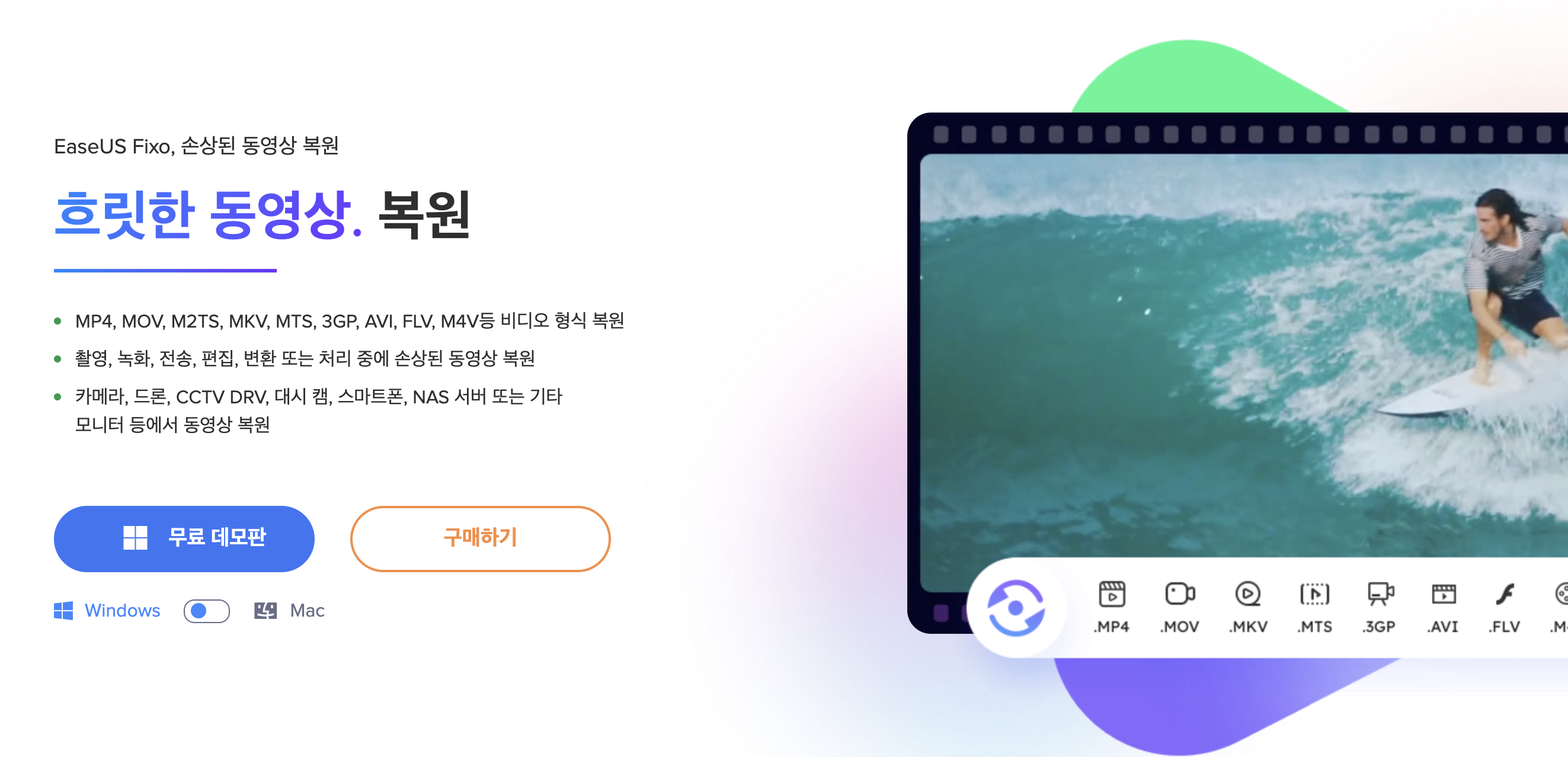 이지어스 EaseUS Fixo 프로그램은 손상된 동영상을 복원할 수 있게 준비된 프로그램입니다. 재생할 수 없는 동영상, 화면이 깜빡이는 동영상, 흐릿한 동영상, 고르지 못한 동영상을 복원할 수 있게 도와주는 프로그램입니다.
