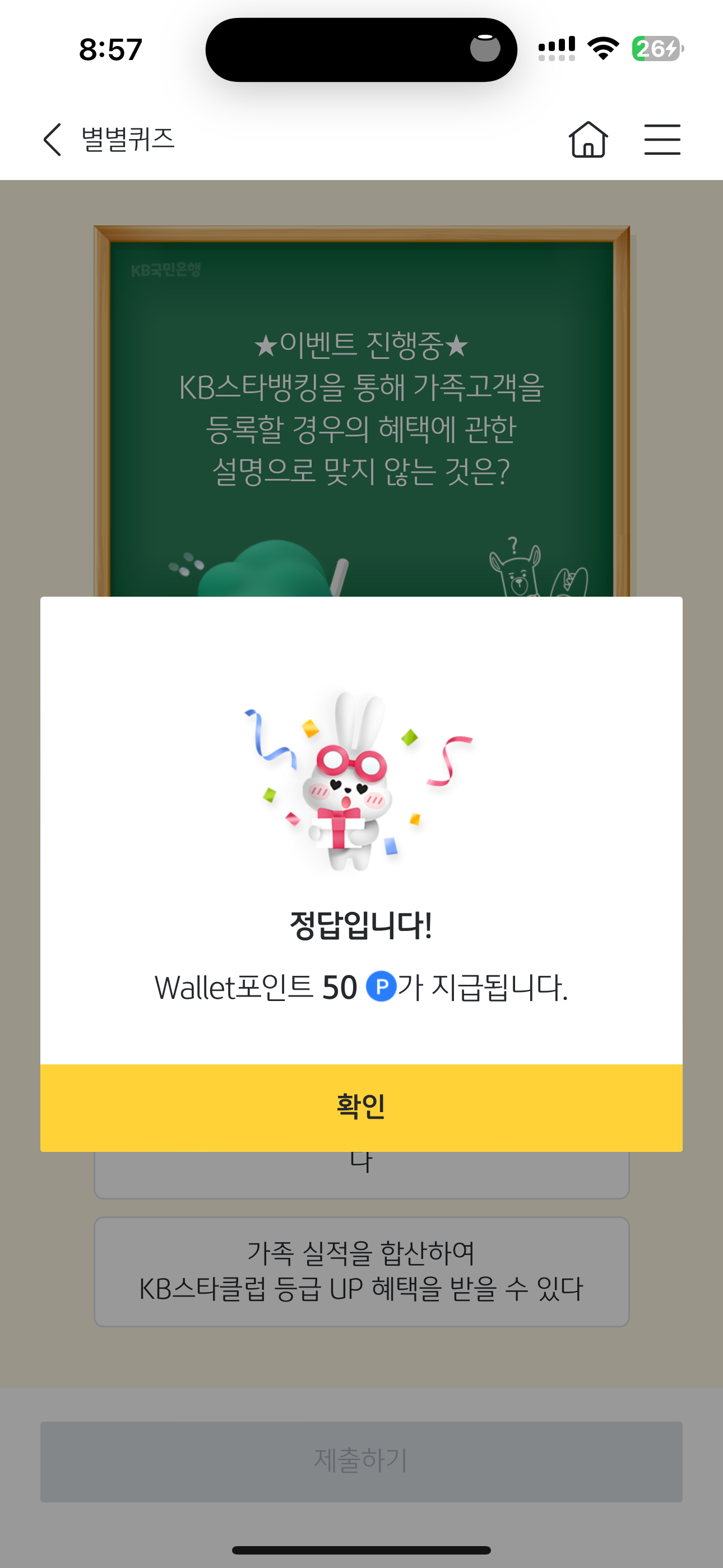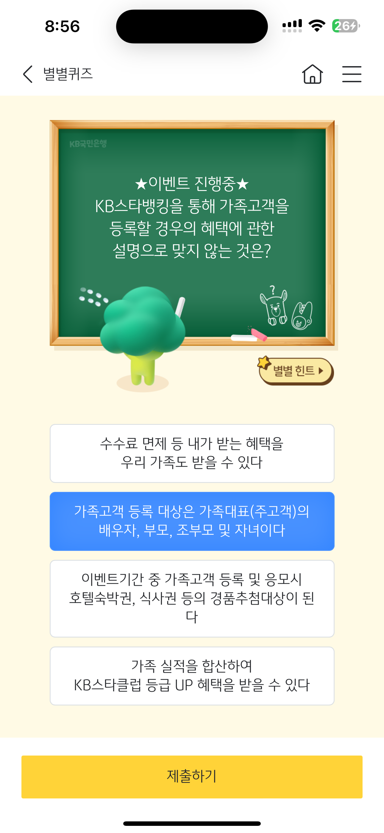 KB스타뱅킹 별별퀴즈 정답은 가족고객 등록 대상은 가족대표(주고객)의 배우자, 부모, 조부모 및 자녀이다 입니다