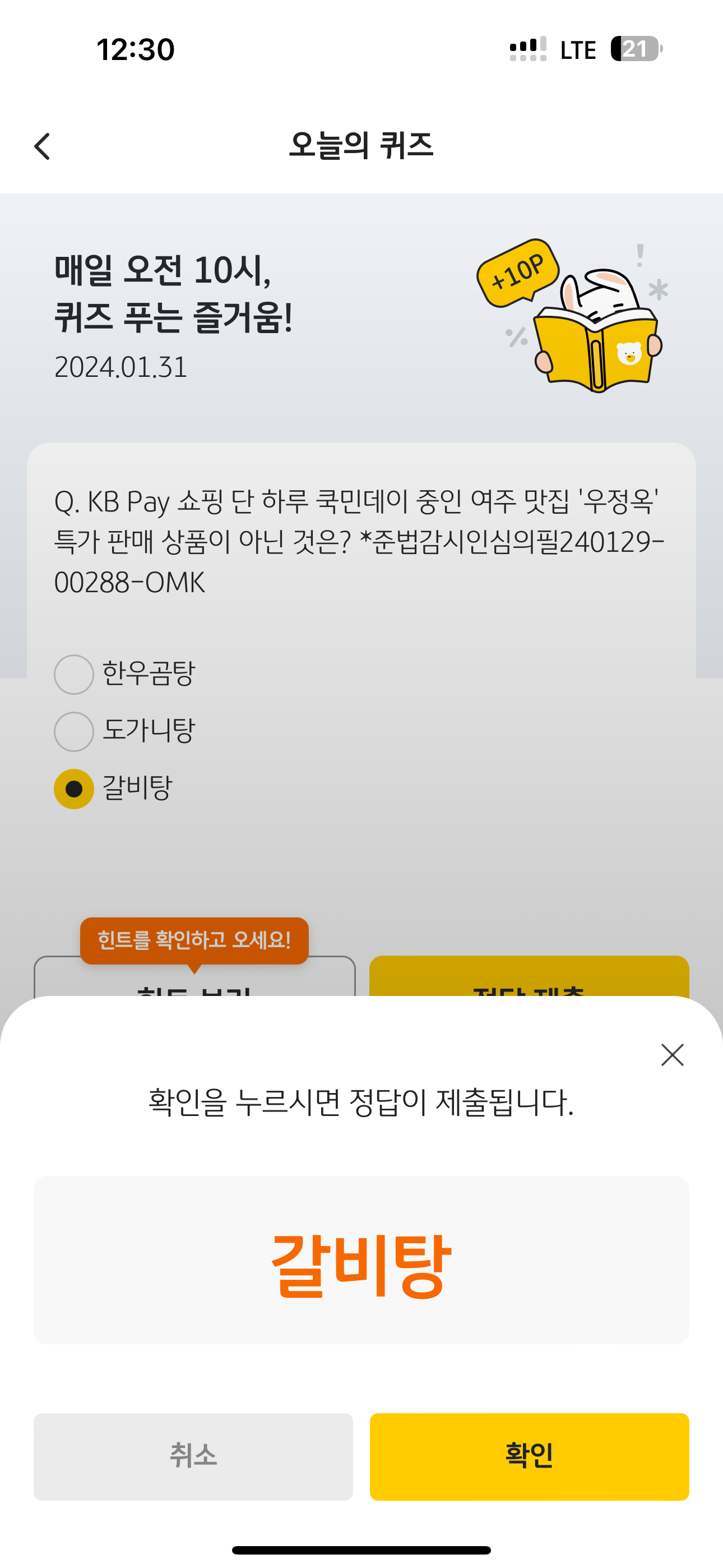 KB Pay 오늘의 퀴즈 정답은 갈비탕 입니다