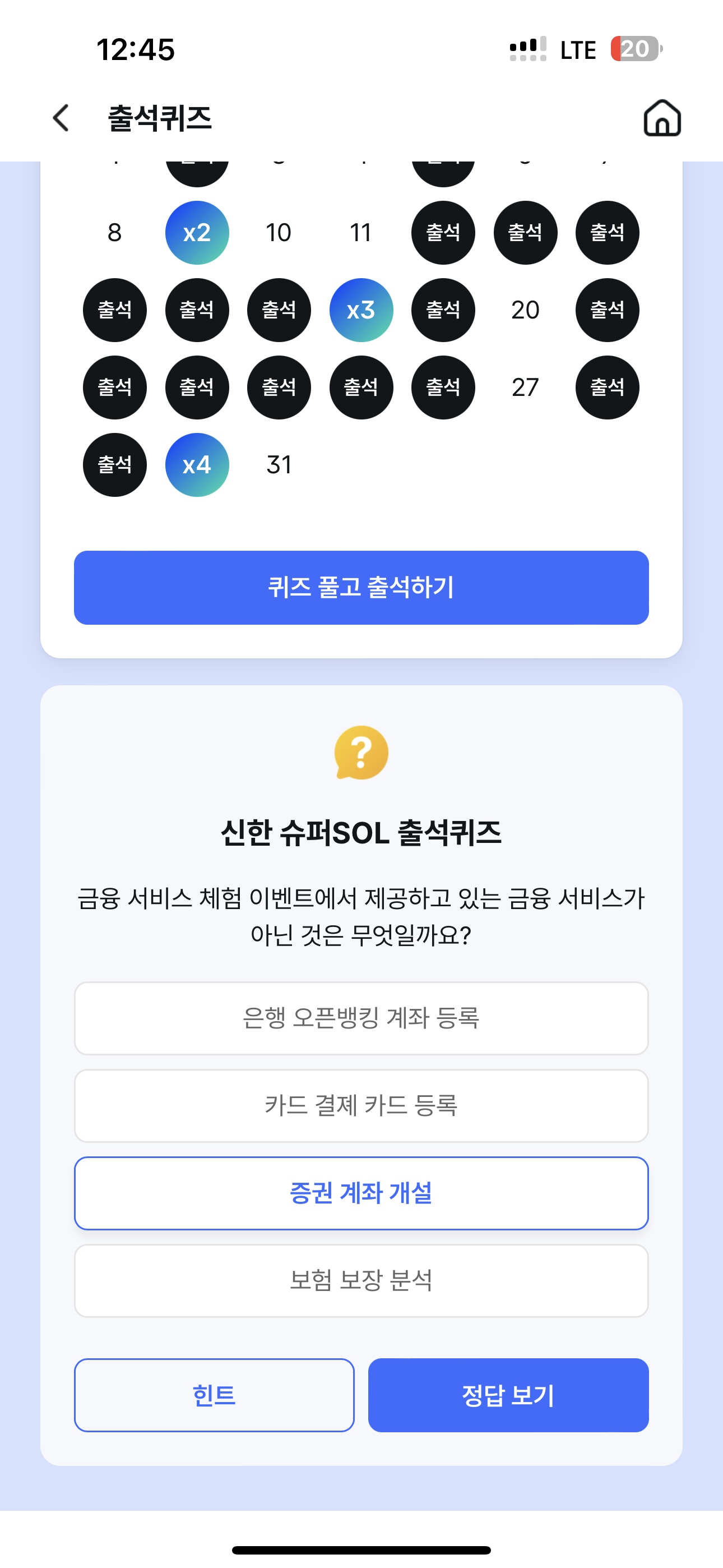 신한 슈퍼SOL 출석퀴즈 금융 서비스 체험 이벤트에서 제공하고 있는 금융 서비스가 아닌 것은 무엇일까요? 보기는 1. 은행 오픈뱅킹 계좌 등록 2. 카드 결제 카드 등록 3. 증권 계좌 개설, 4. 보험 보장 분석 입니다.