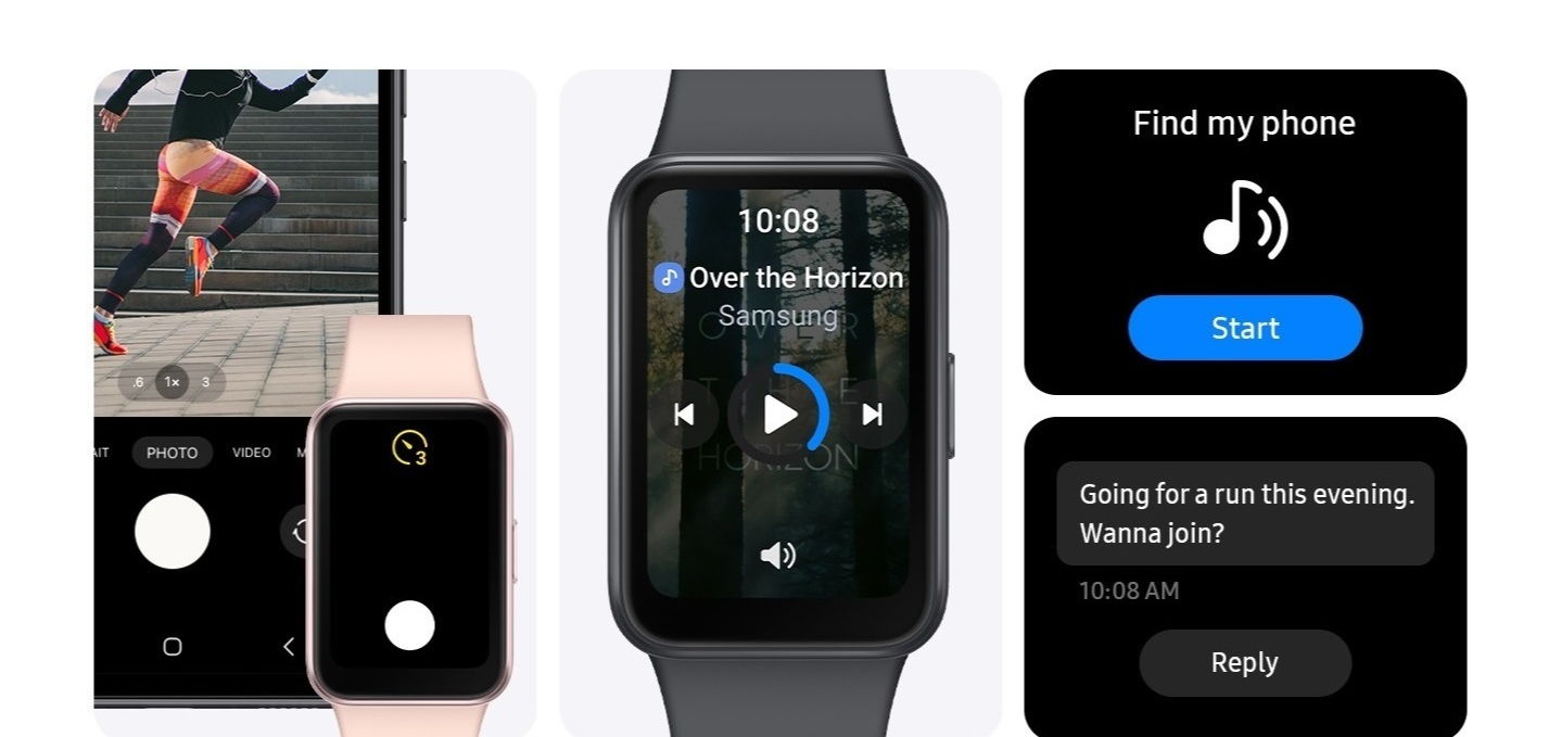 삼성 갤럭시핏3는 카메라 리모컨 지원, 미디어 컨트롤, 나의 폰 찾기 지원, 메시지 확인 및 회신을 지원합니다.