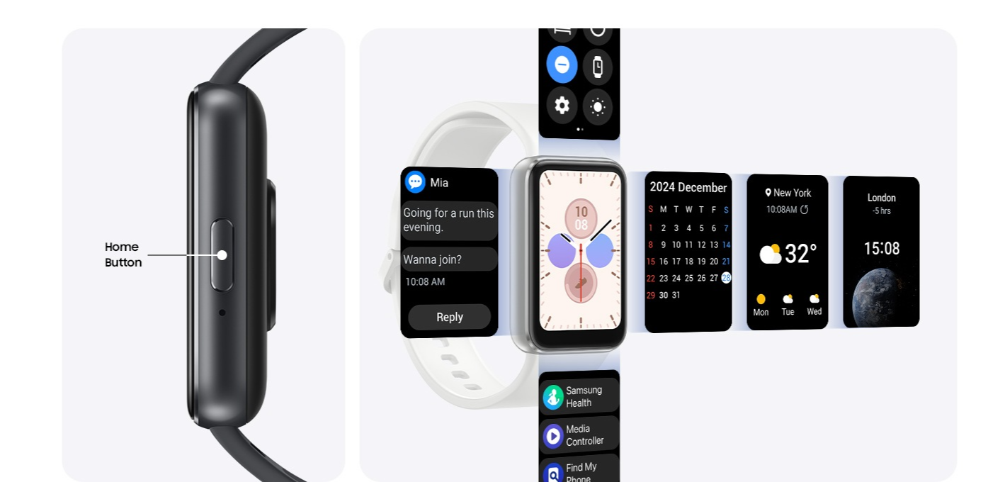 삼성 갤럭시핏3는 카메라 리모컨 지원, 미디어 컨트롤, 나의 폰 찾기 지원, 메시지 확인 및 회신을 지원합니다.