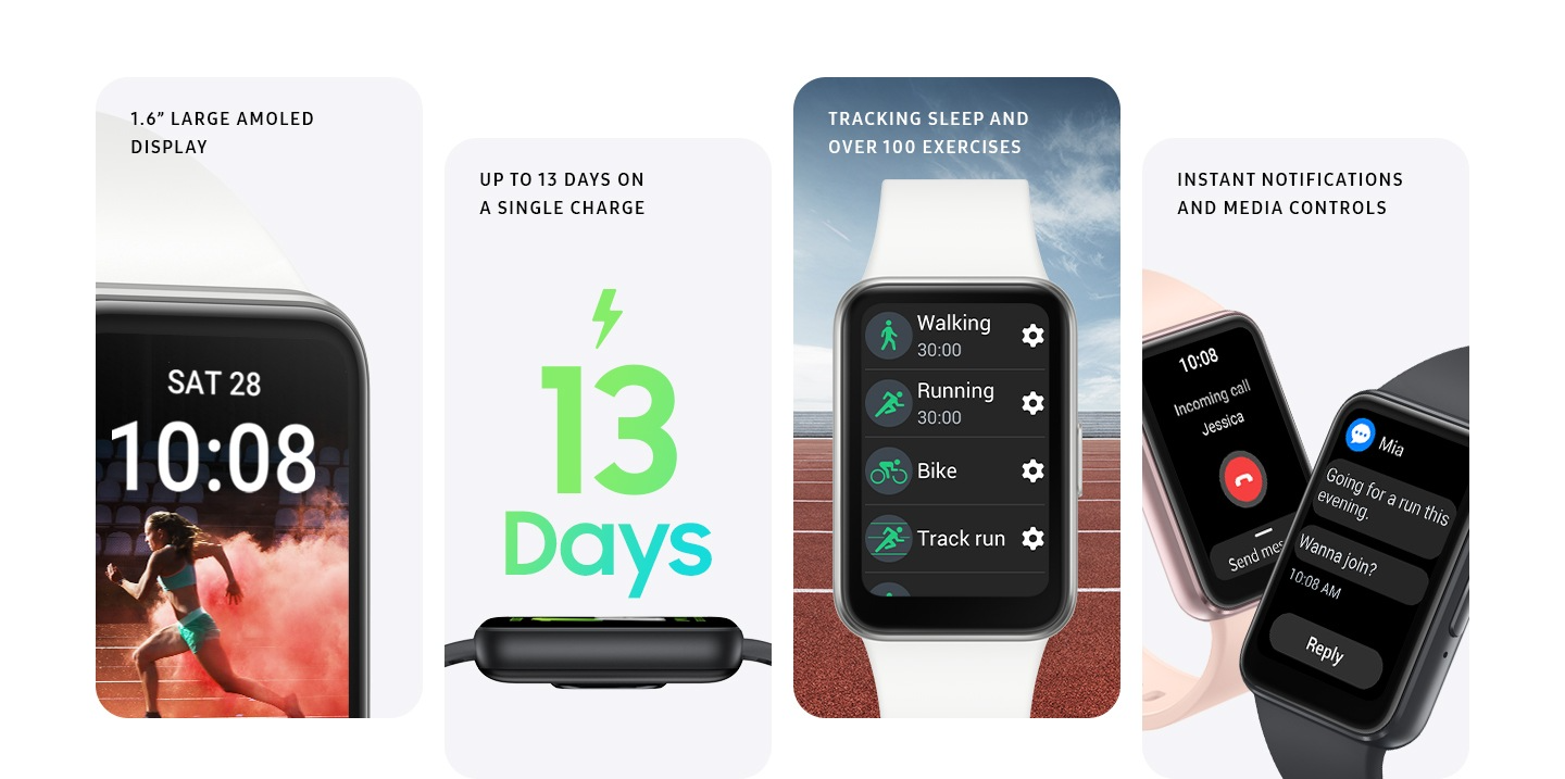 삼성 갤럭시핏3 화면 사이즈는 1.6인치 AMOLED 디스플레이이고 13일간 사용이 가능하다고 합니다. 그리고 100가지 이상 운동 모드 지원, 다양한 알림, 미디어 컨트롤을 지원합니다.