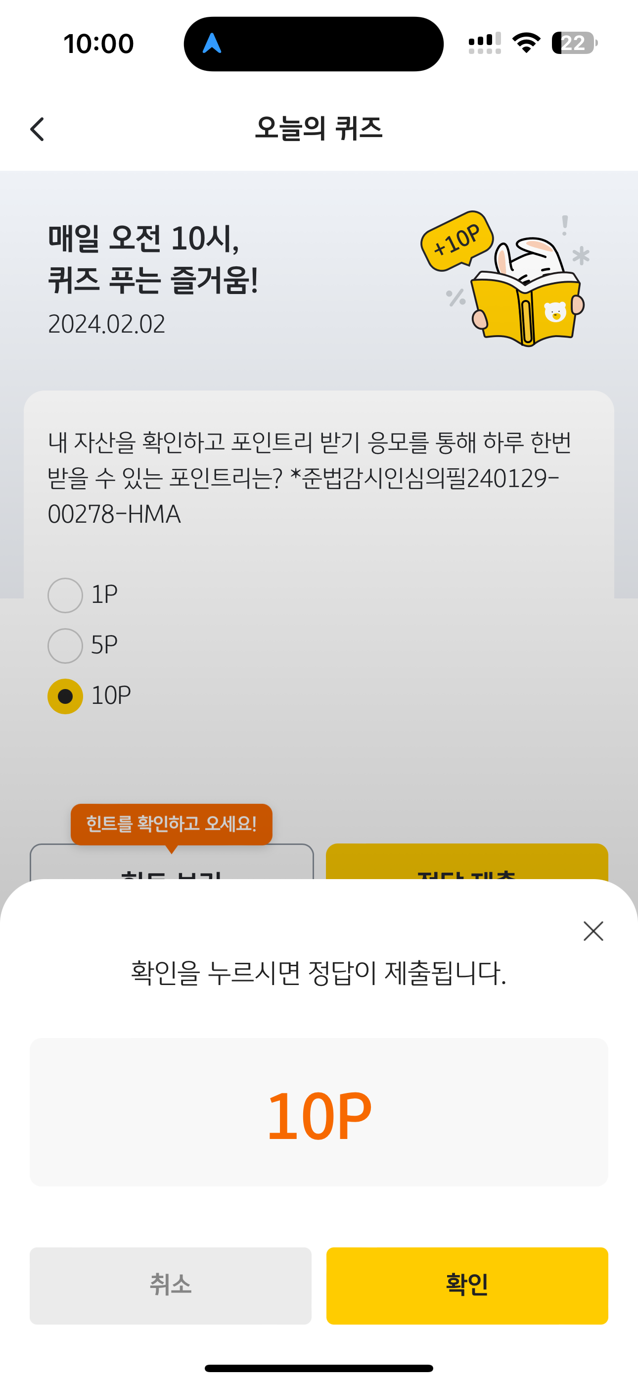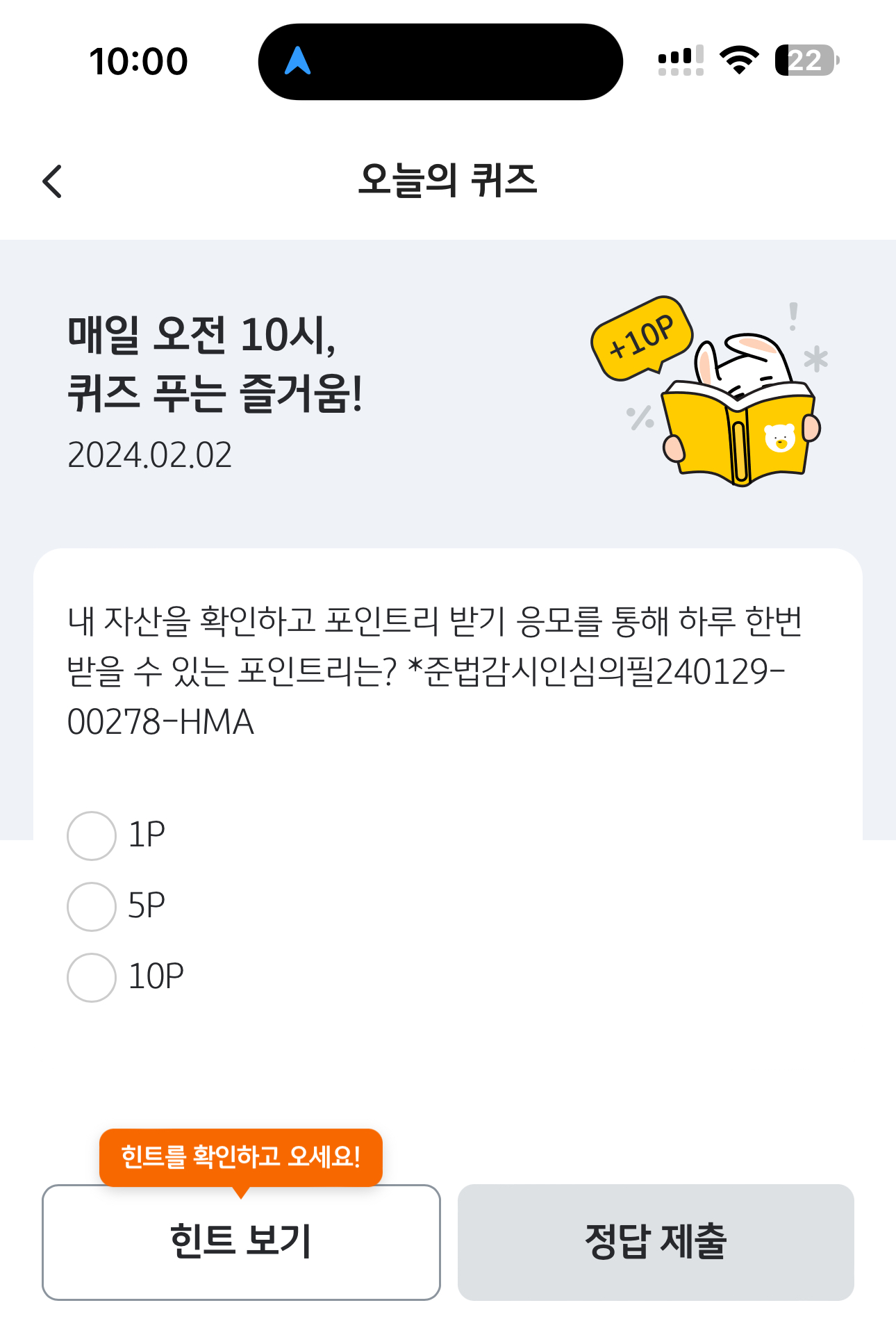 2024년 2월 2일 KB Pay 오늘의 퀴즈 내 자산을 확인하고 포인트리 받기 응모를 통해 하루 한번 받을 수 있는 포인트리는? *준법감시인심의필240129-00278-HMA 보기는 1. 1P 2. 5P 3. 10P 입니다.