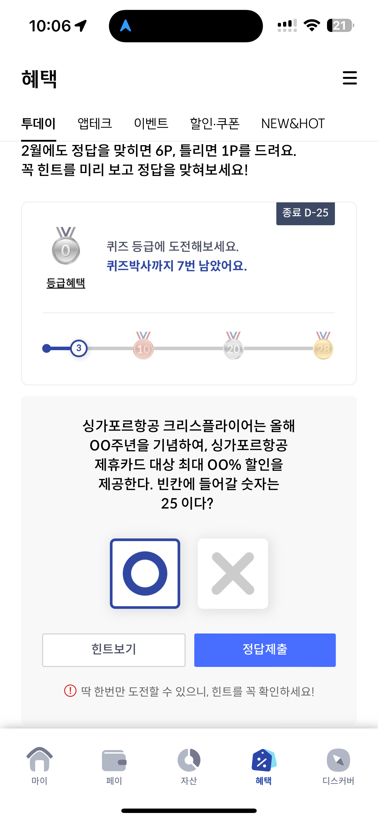 신한카드 퀴즈팡팡 2월 4일 문제 싱가포르항공 크리스플라이어는 올해 OO주년을 기념하여, 싱가포르항공 제휴카드 대상 최대 OO% 할인을 제공한다. 빈칸에 들어갈 숫자는 25 이다? O,X 퀴즈인데요.