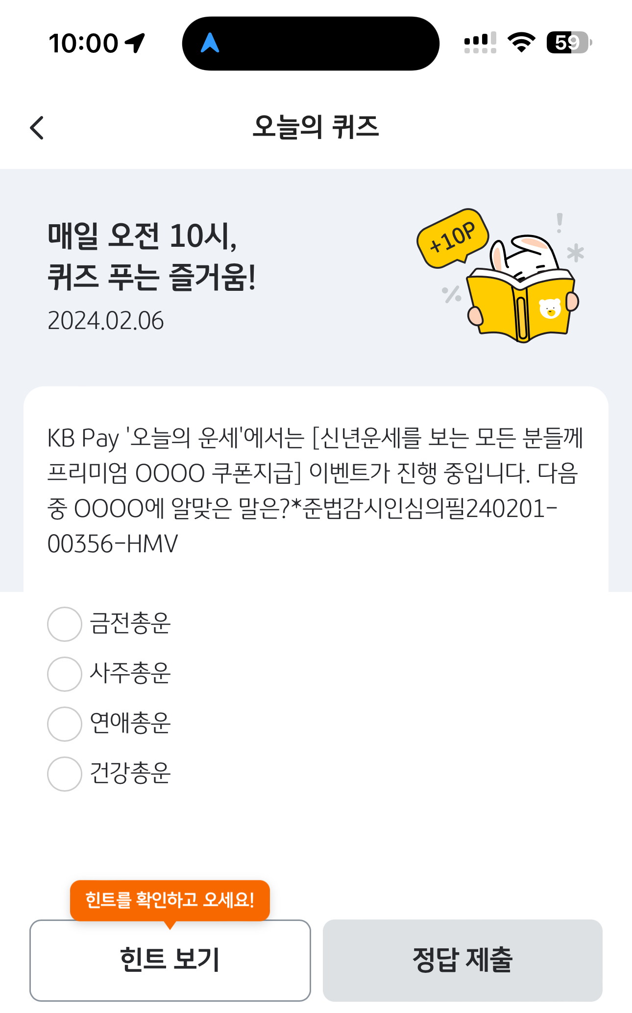 KB Pay '오늘의 운세'에서는 [신년운세를 보는 모든 분들께 프리미엄 OOOO 쿠폰지급] 이벤트가 진행 중입니다. 다음중 OOOO에 알맞은 말은?*준법감시인심의필240201-00356-HMV 보기는 1. 금전총운 2. 사주총운 3. 연애총운 4. 건강총운 입니다.