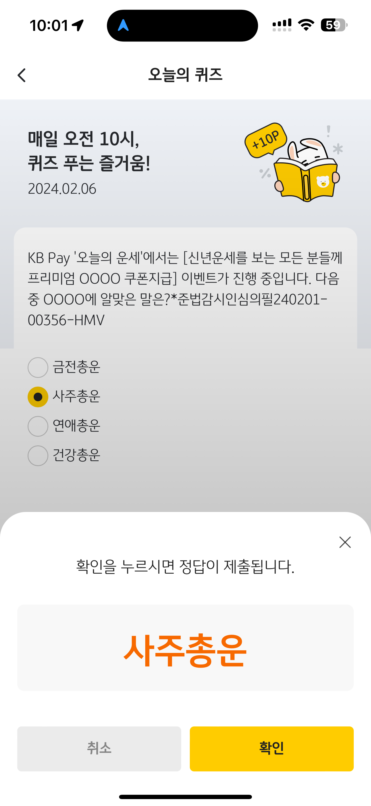 KB Pay 오늘의 퀴즈 2월 6일 정답(KB Pay 오늘의 운세에서는 신년운세를 보는 모든 분들께 프리미엄 OOOO 쿠폰지급 이벤트)