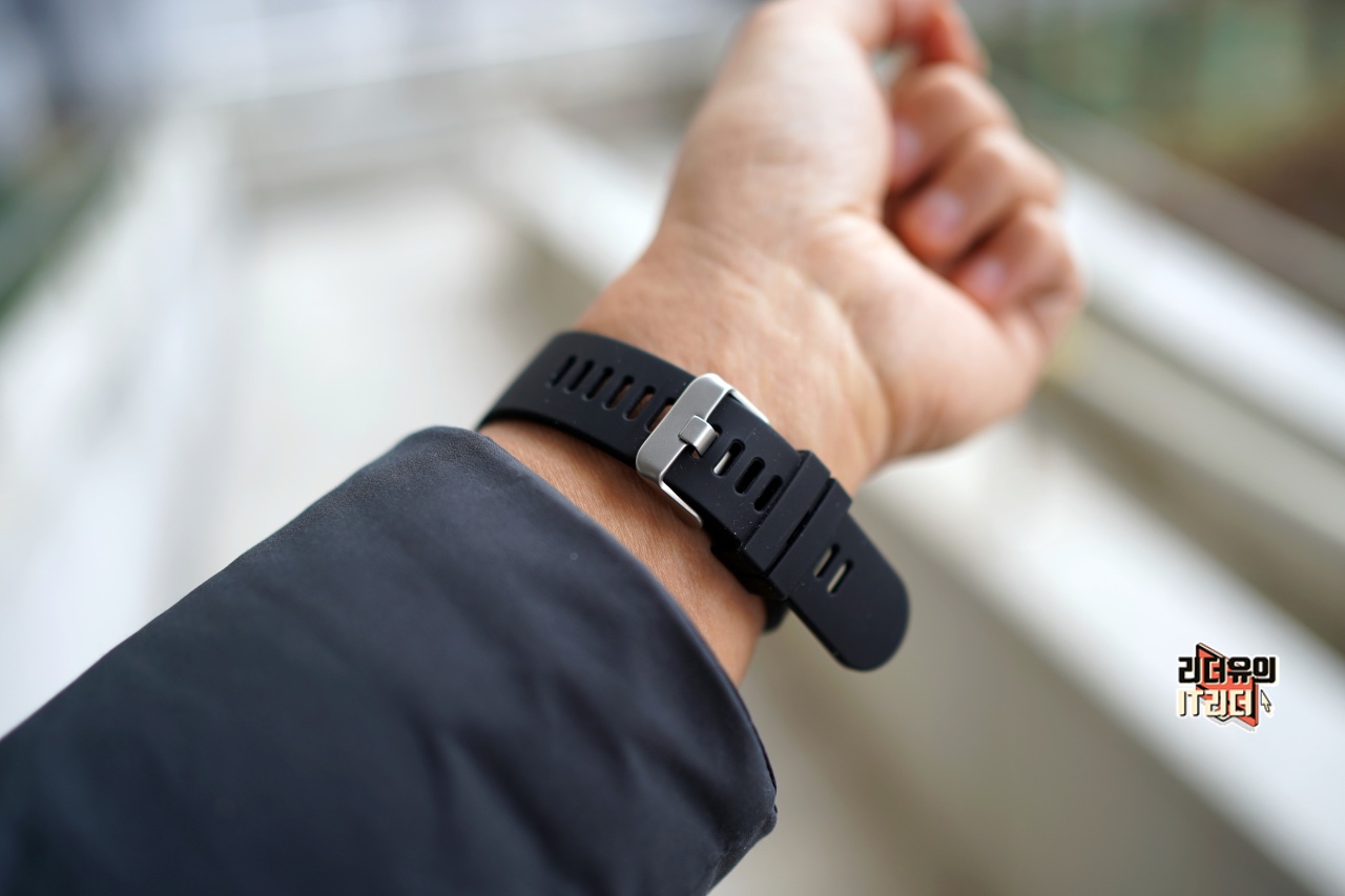 기본 스트랩 체결된 모습입니다. 일반적인 시계 형태로 안정된 사용을 할 수 있습니다.