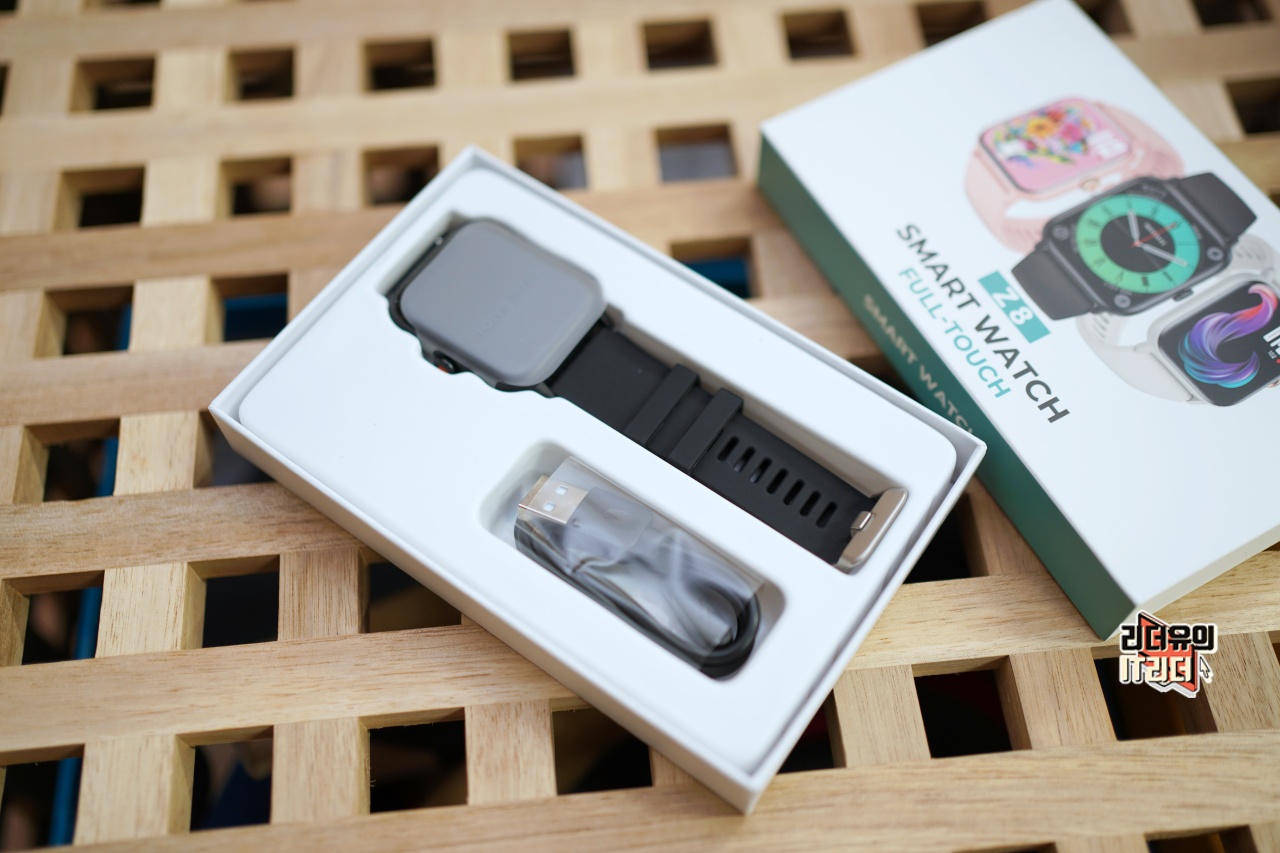 티씨어즈 스마트워치 Z8 개봉을 하면 밴드가 체결된 스마트워치와 충전 케이블을 볼 수 있습니다.