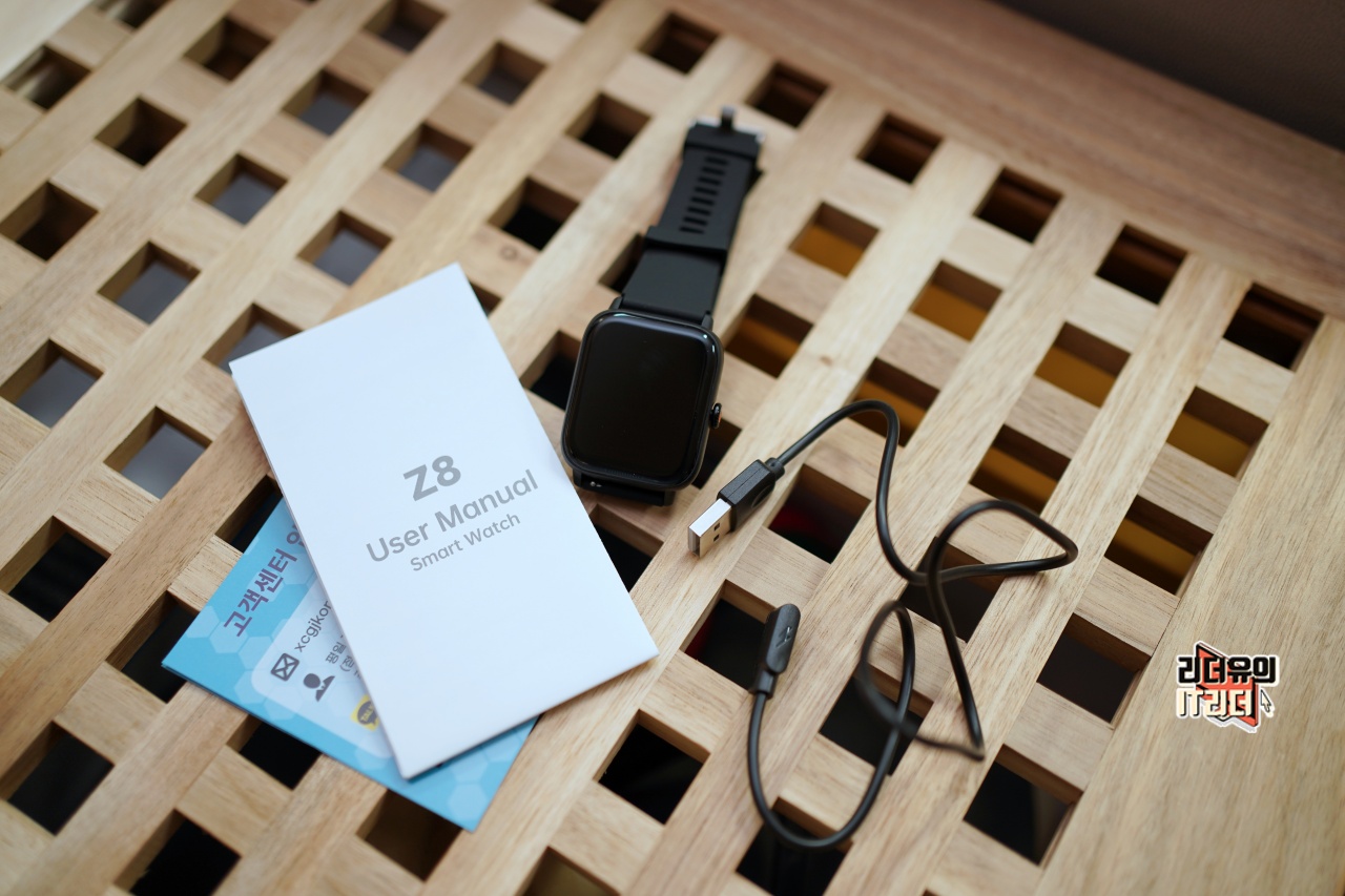 티씨어즈 스마트워치 Z8 구성품은 본체, 충전 케이블, 매뉴얼로 구성되어 있습니다.