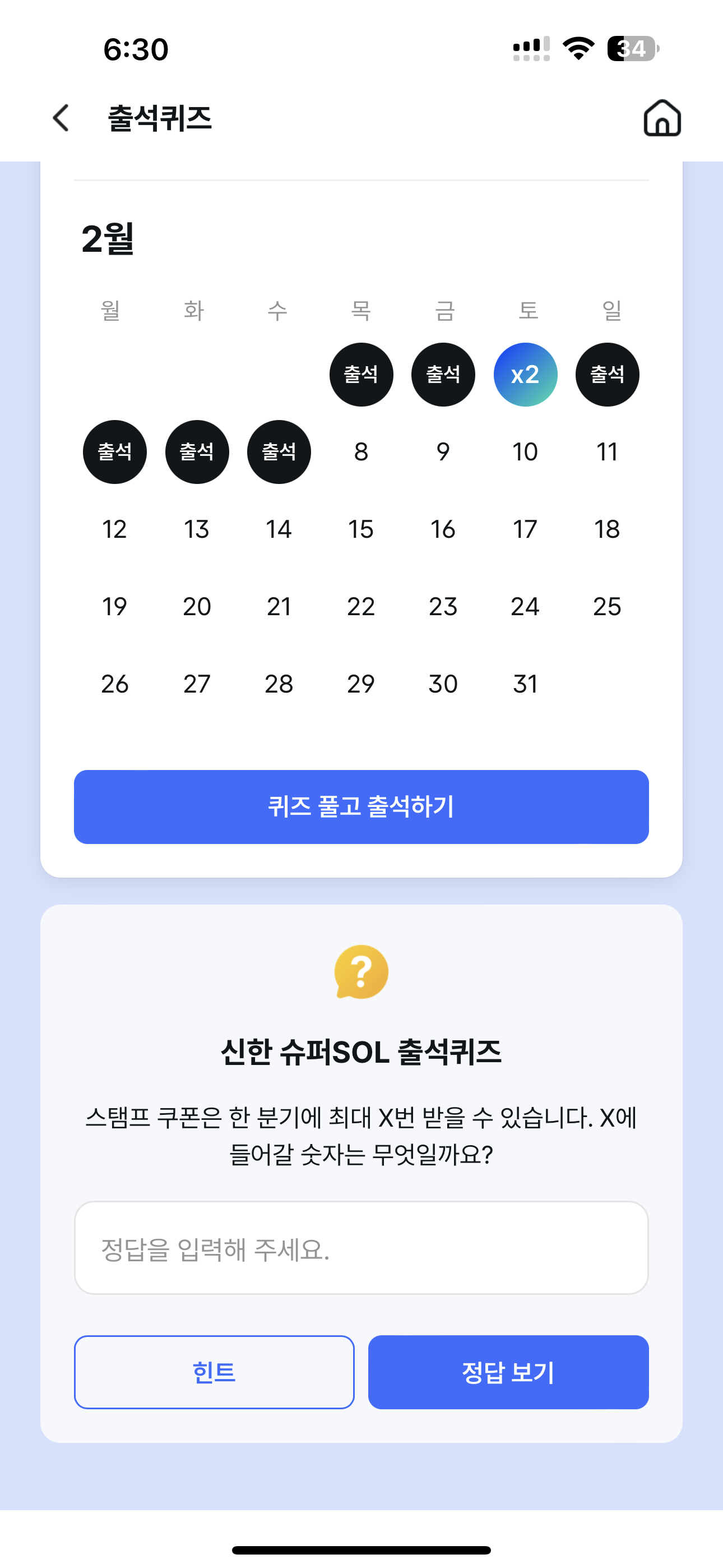 2월 8일 신한 슈퍼SOL 출석퀴즈 스탬프 쿠폰은 한 분기에 최대 X번 받을 수 있습니다. X에 들어갈 숫자는 무엇일까요? 주관식 퀴즈인데요.