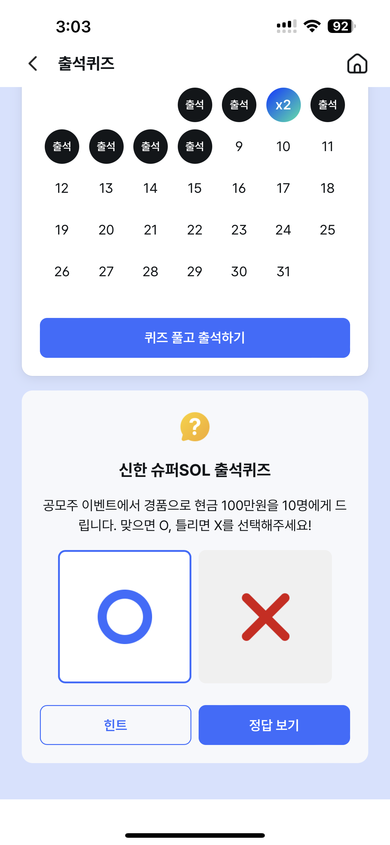 신한 슈퍼SOL 출석퀴즈 정답은 O 입니다