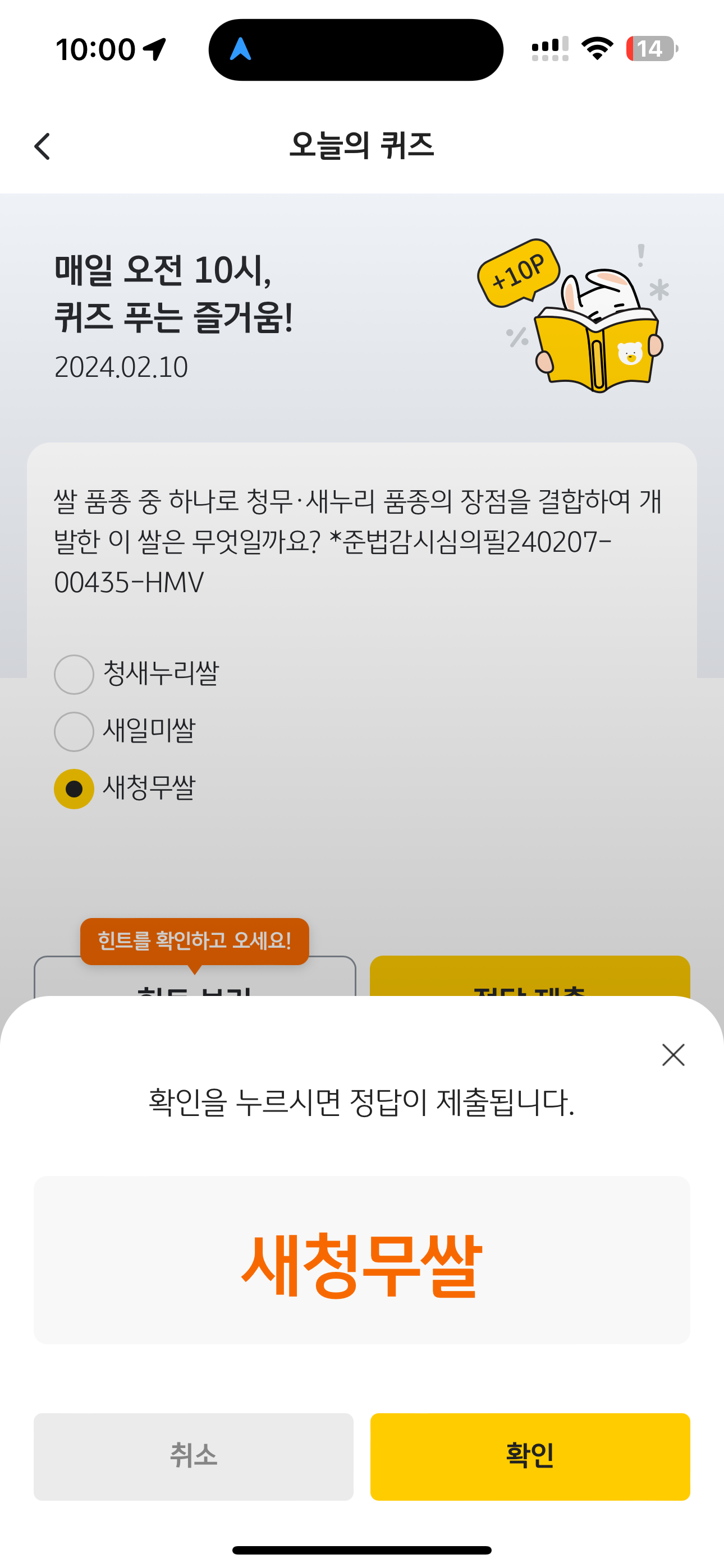 KB Pay 오늘의 퀴즈 정답은 새청무쌀 입니다