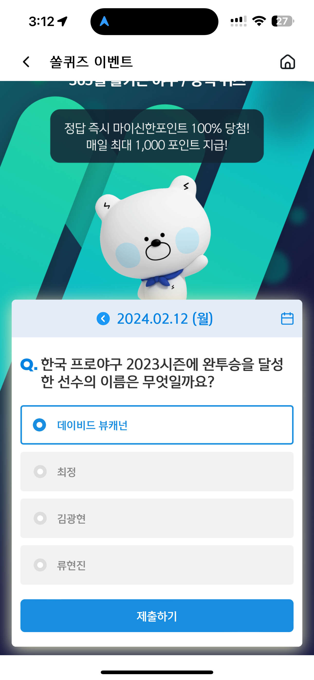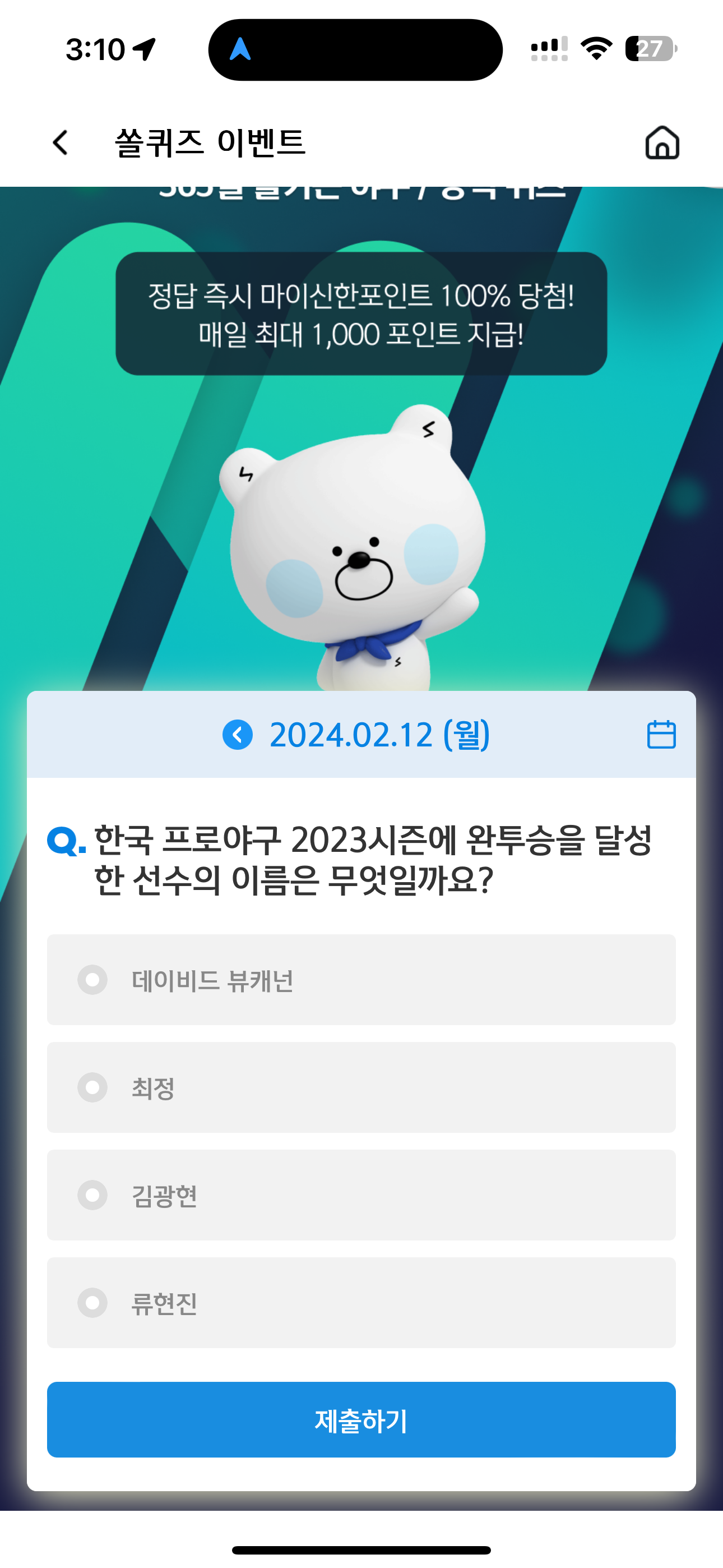 신한 슈퍼SOL 야구/상식 쏠퀴즈 2월 12일 문제입니다.