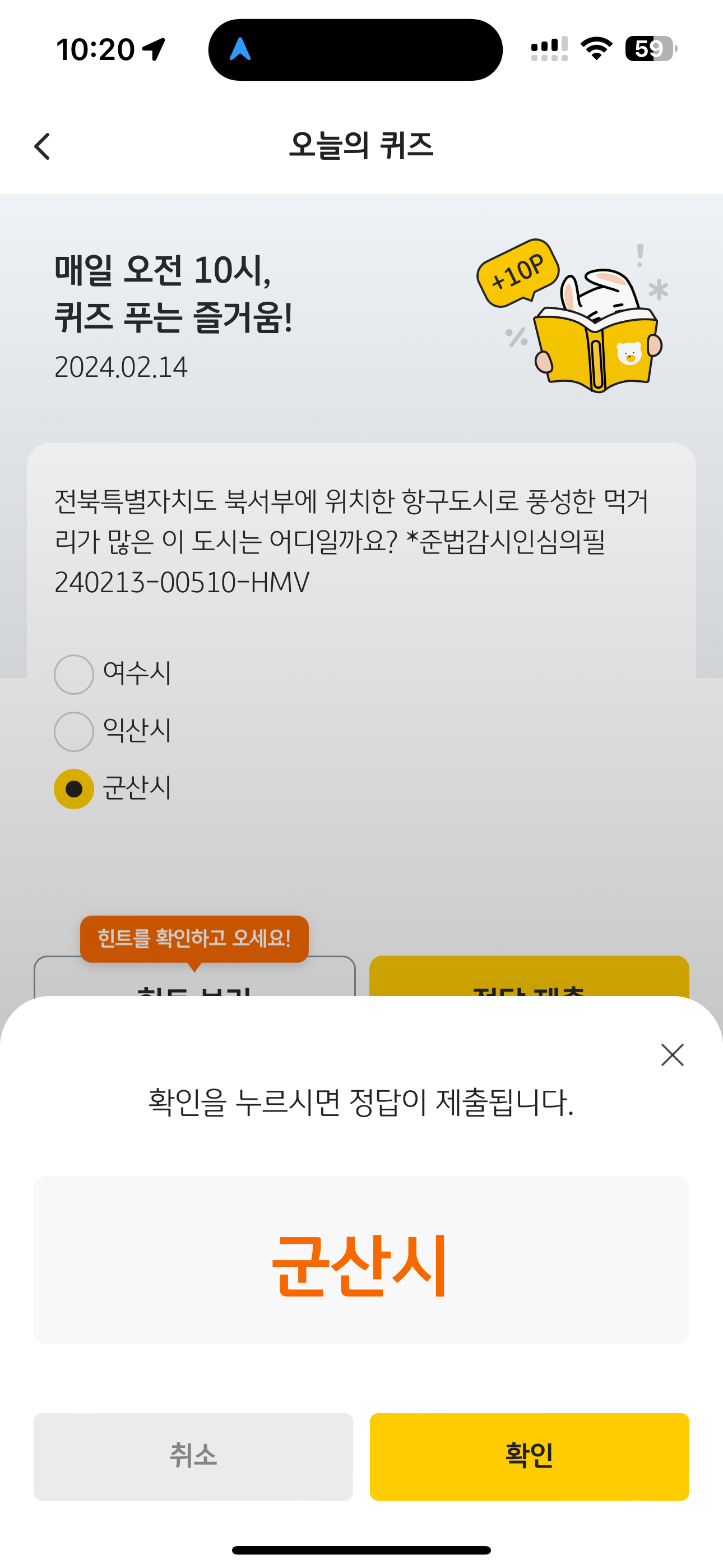 KB Pay 오늘의 퀴즈 정답은 군산시 입니다