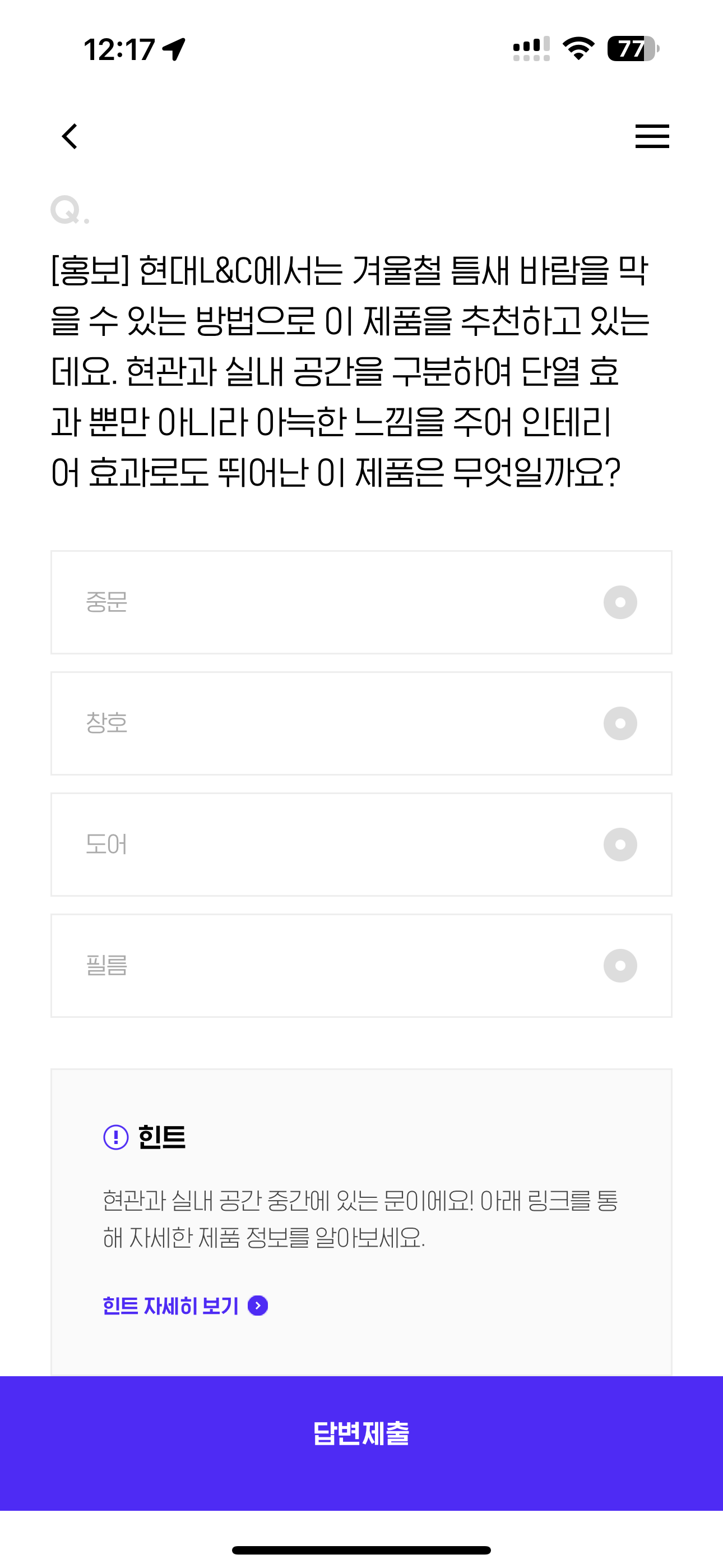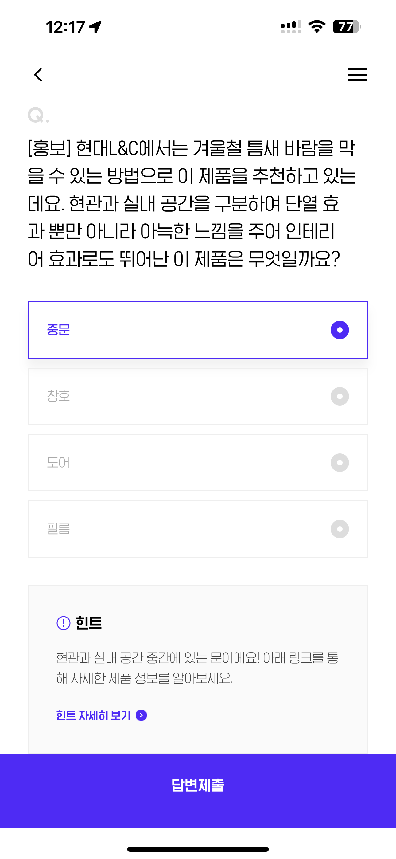 현대L&C에서는 겨울철 틈새 바람을 막을 수 있는 방법으로 이 제품을 추천하고 있는데요. 현관과 실내 공간을 구분하여 단열 효과 뿐만 아니라 아늑한 느낌을 주어 인테리어 효과로도 뛰어난 이 제품은 무엇일까요? 보기는 1. 중문 2. 창호 3. 도어 4. 필름 입니다.