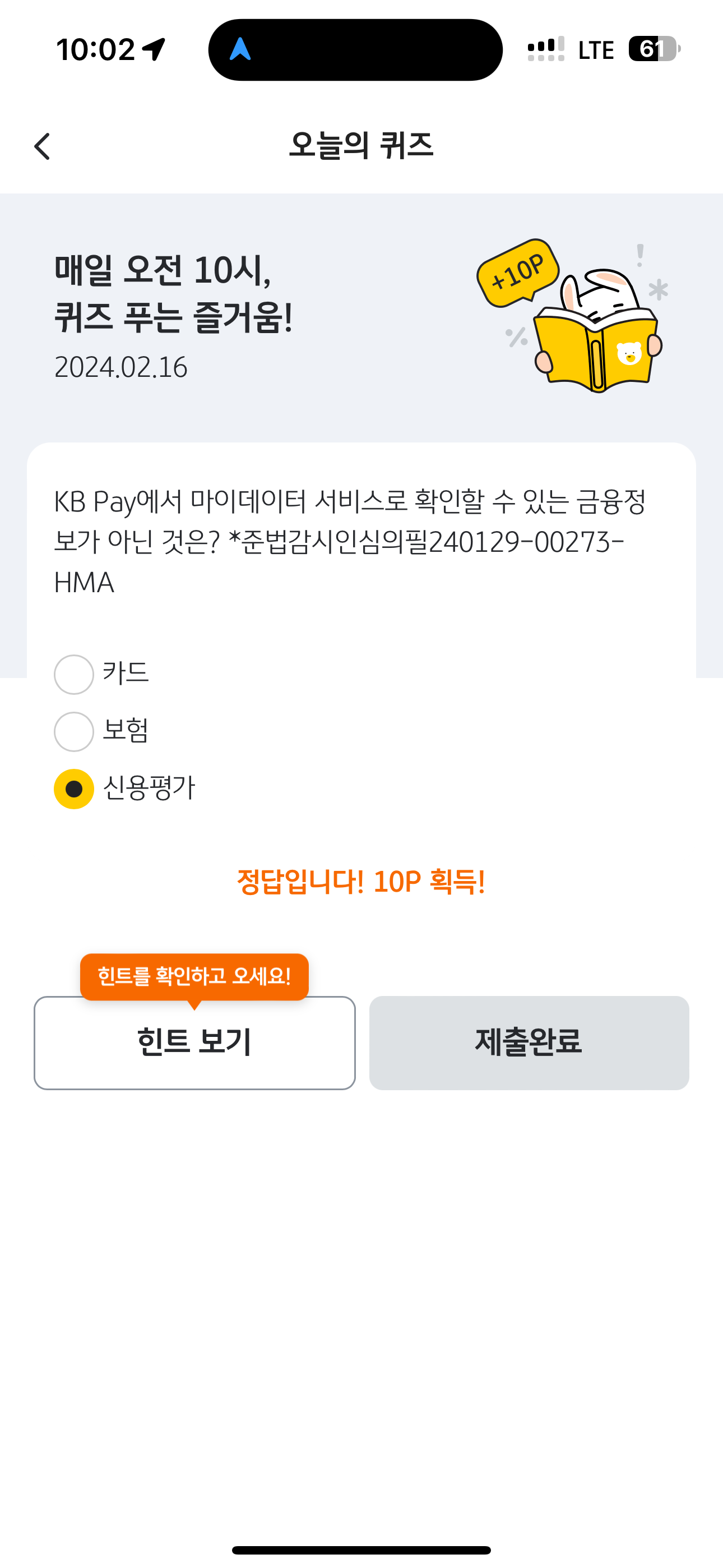 KB Pay 오늘의 퀴즈 정답은 신용평가 입니다