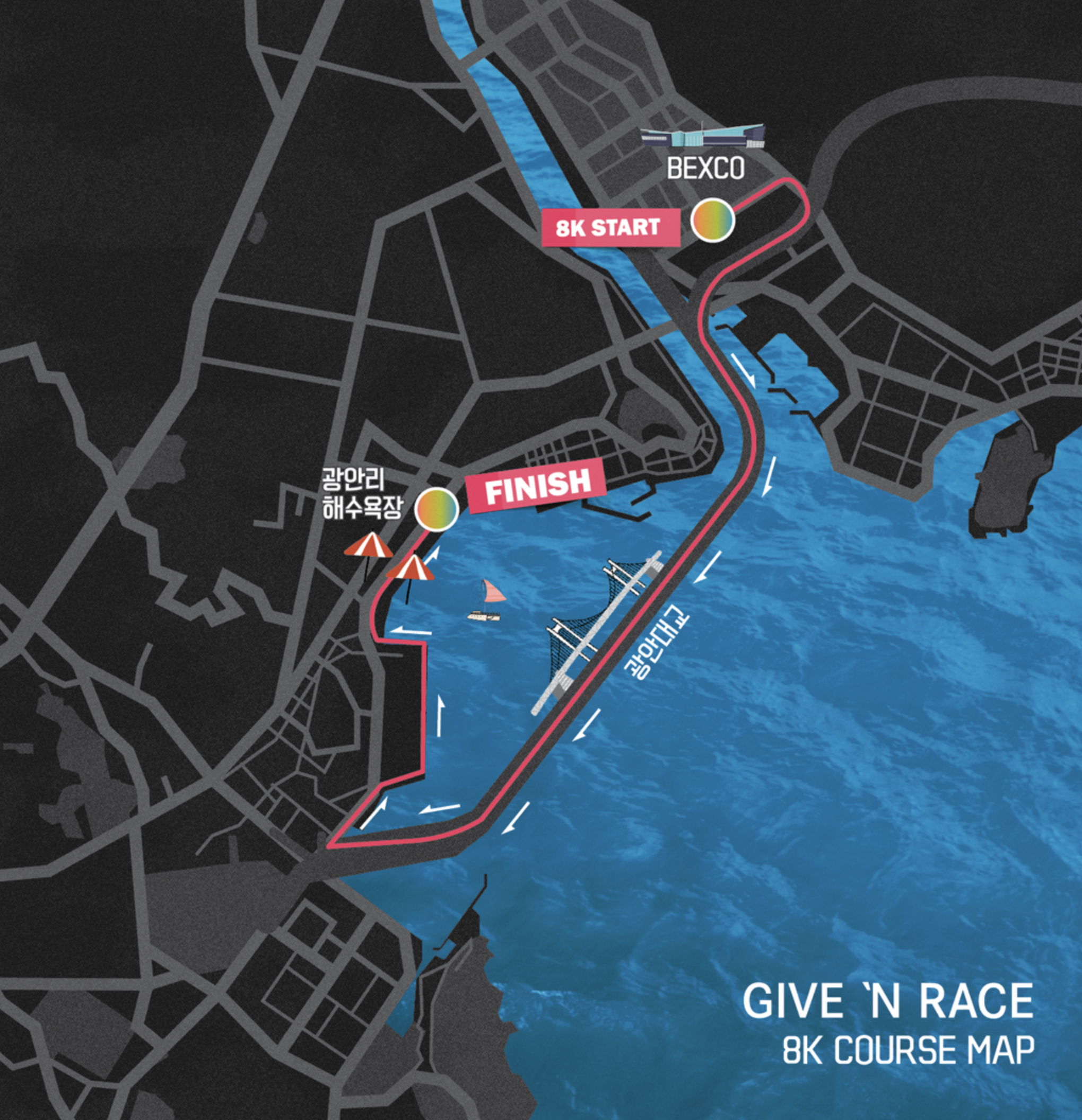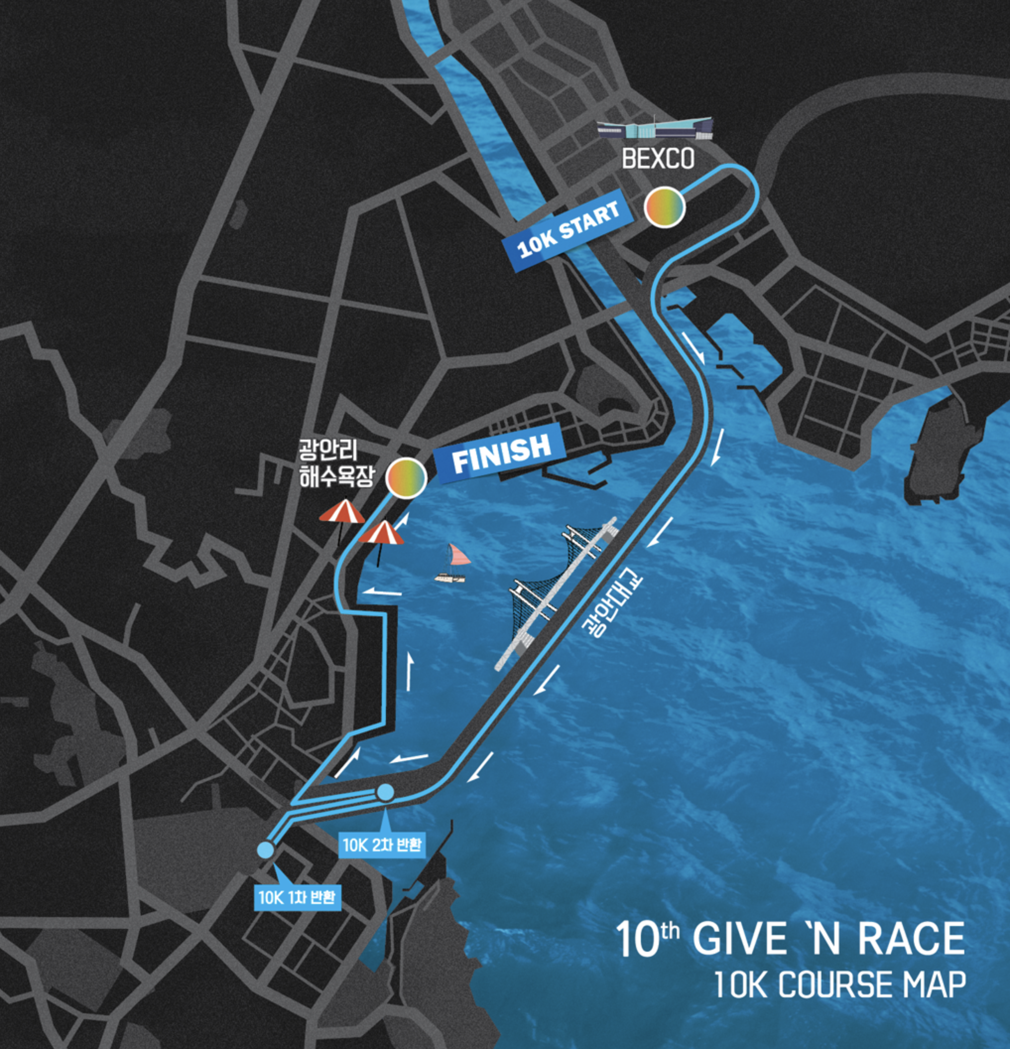 10km 마라톤 코스입니다. 백스코를 출발해 광안대교를 건너고 해안도로를 달려 광안리해수욕장까지 도착하는 코스입니다. 바다를 보면서 달릴 수 있어 재미있는 경험이 될 것 같습니다.