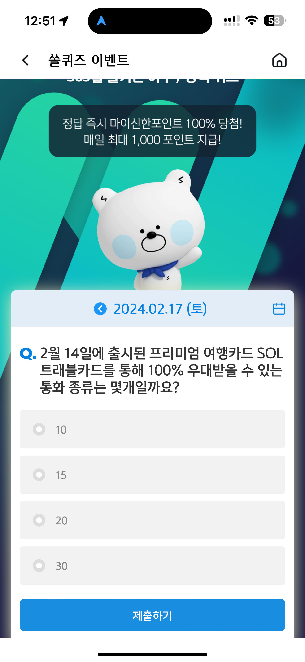 2024년 2월 17일 신한 슈퍼SOL 야구/상식 쏠퀴즈 문제 2월 14일에 출시된 프리미엄 여행카드 SOL트래블카드를 통해 100% 우대받을 수 있는 통화 종류는 몇개일까요? 보기는 1. 10 2. 15 3. 20 4. 30 입니다