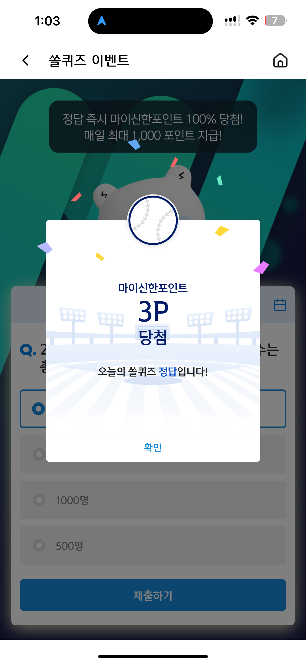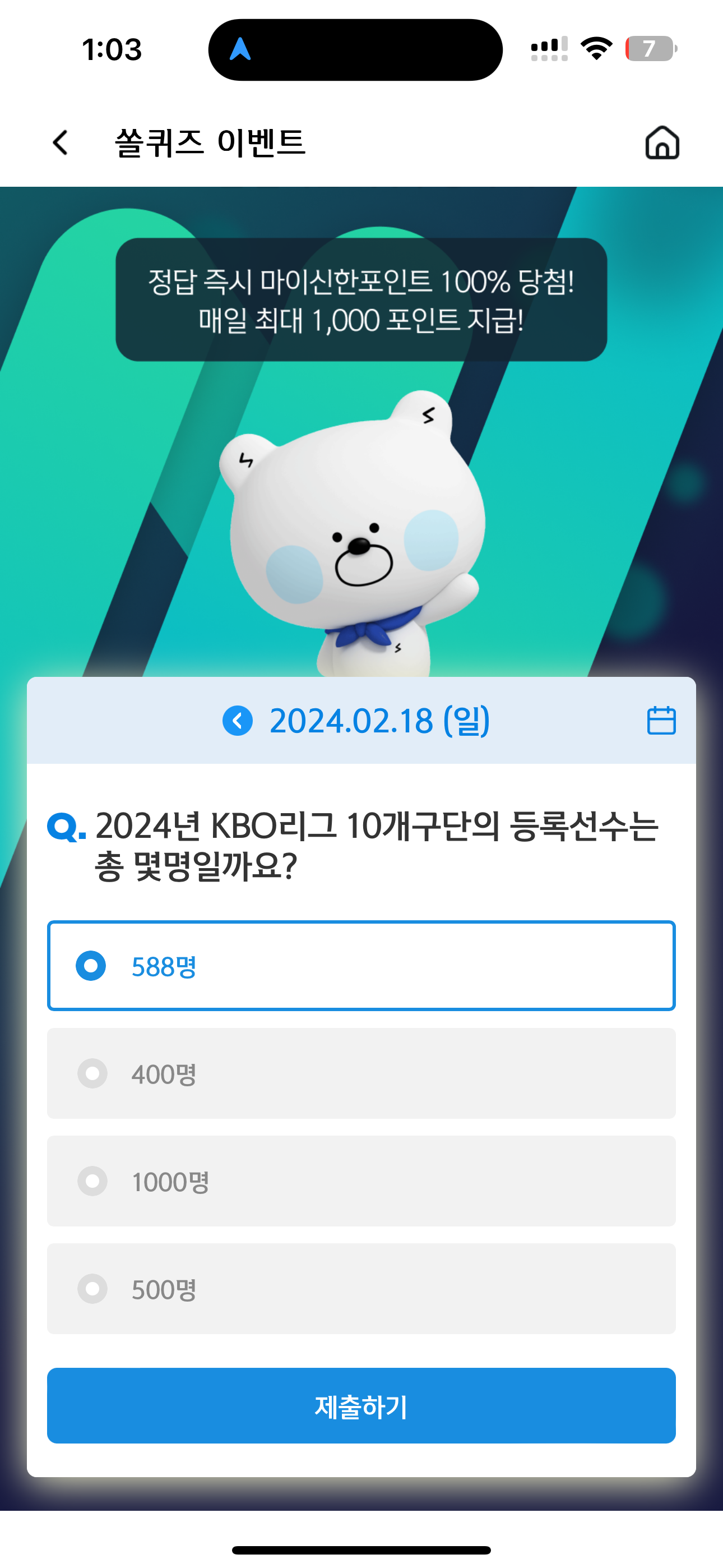 신한 슈퍼SOL 야구/상식 쏠퀴즈 정답은 588명 입니다