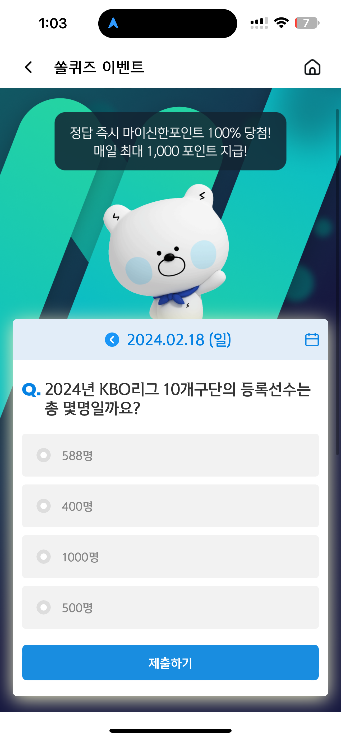 2024년 02월 18일 (일) 신한 슈퍼SOL 야구/상식 쏠퀴즈 문제 2024년 KBO리그 10개구단의 등록선수는 총 몇명일까요? 보기는 1. 588명 2. 400명 3. 1000명 4. 500명 입니다.