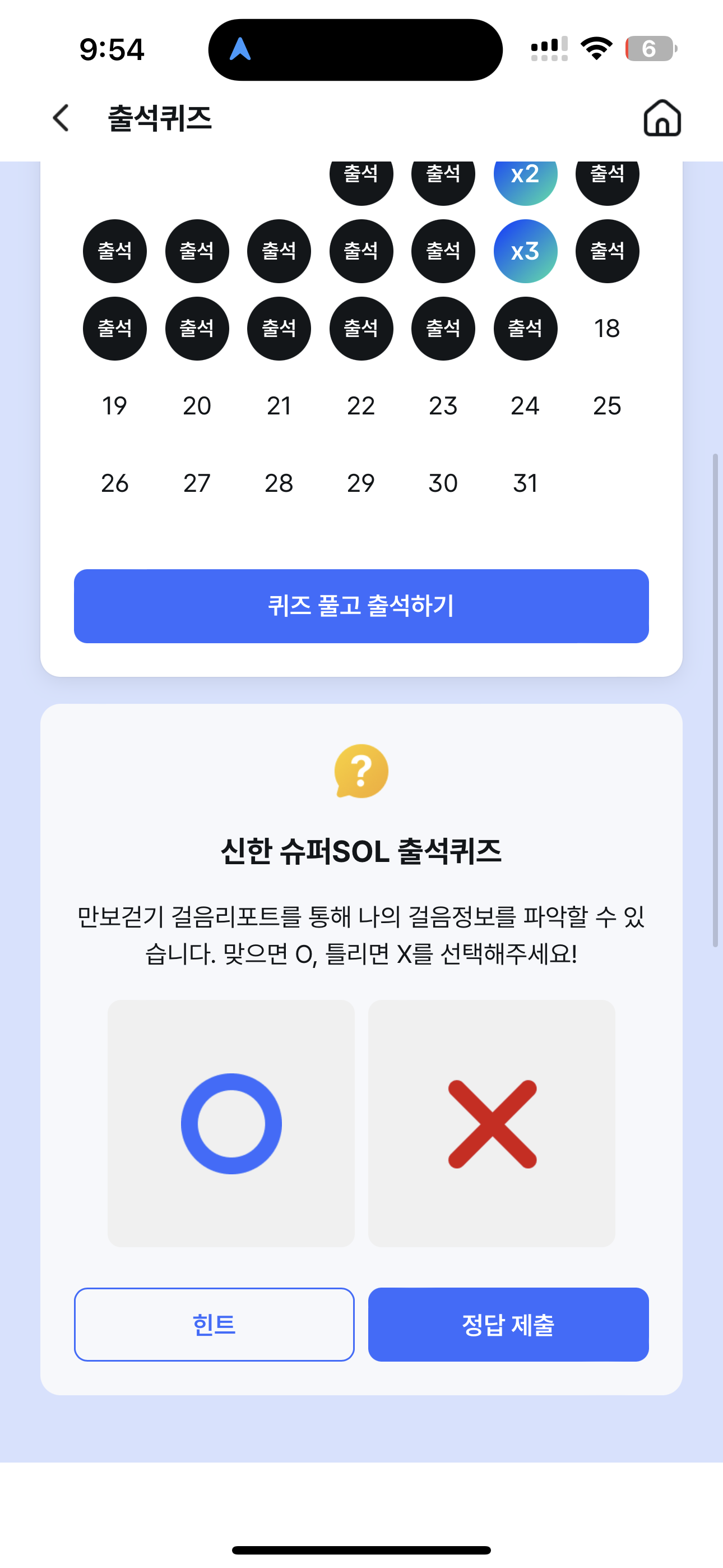 2024년 2월 18일 신한 슈퍼SOL 출석퀴즈 문제 만보걷기 걸음리포트를 통해 나의 걸음정보를 파악할 수 있습니다. 맞으면 O, 틀리면 X를 선택해주세요! O,X 퀴즈인데요.