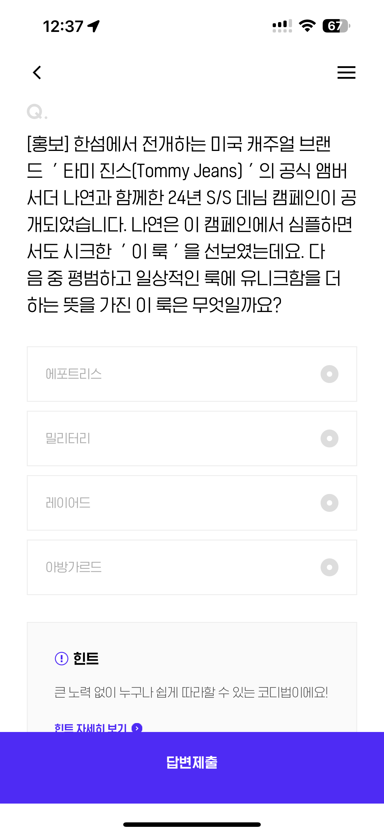 [홍보] 한섬에서 전개하는 미국 캐주얼 브랜드 ' 타미 진스[Tommy Jeans] ' 의 공식 앰버서더 나연과 함께한 24년 S/S 데님 캠페인이 공개되었습니다. 나연은 이 캠페인에서 심플하면서도 시크한 ' 이 룩 ' 을 선보였는데요. 다음 중 평범하고 일상적인 룩에 유니크함을 더하는 뜻을 가진 이 룩은 무엇일까요? 보기는 1. 애포트리스 2. 밀리터리 3. 레이어드 4. 아방가르드 입니다.