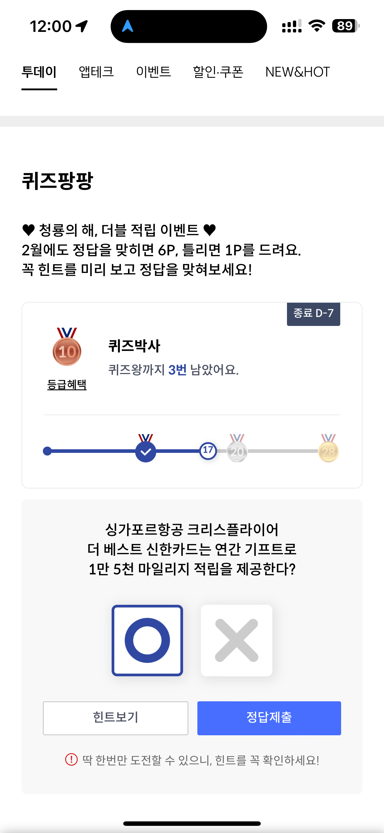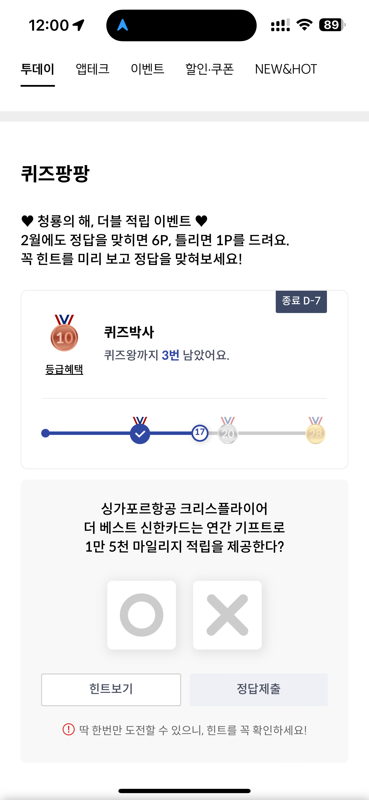 2024년 2월 22일 신한카드 퀴즈팡팡 문제는 싱가포르항공 크리스플라이어 더 베스트 신한카드는 연간 기프트로 1만 5천 마일리지 적립을 제공한다? O,X 퀴즈인데요. 싱가포르항공을 이용할 때 꿀카드입니다.