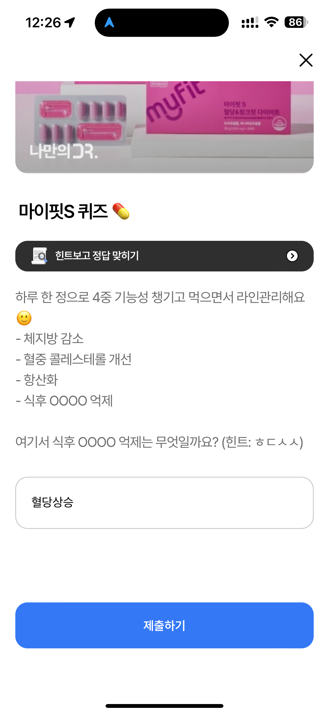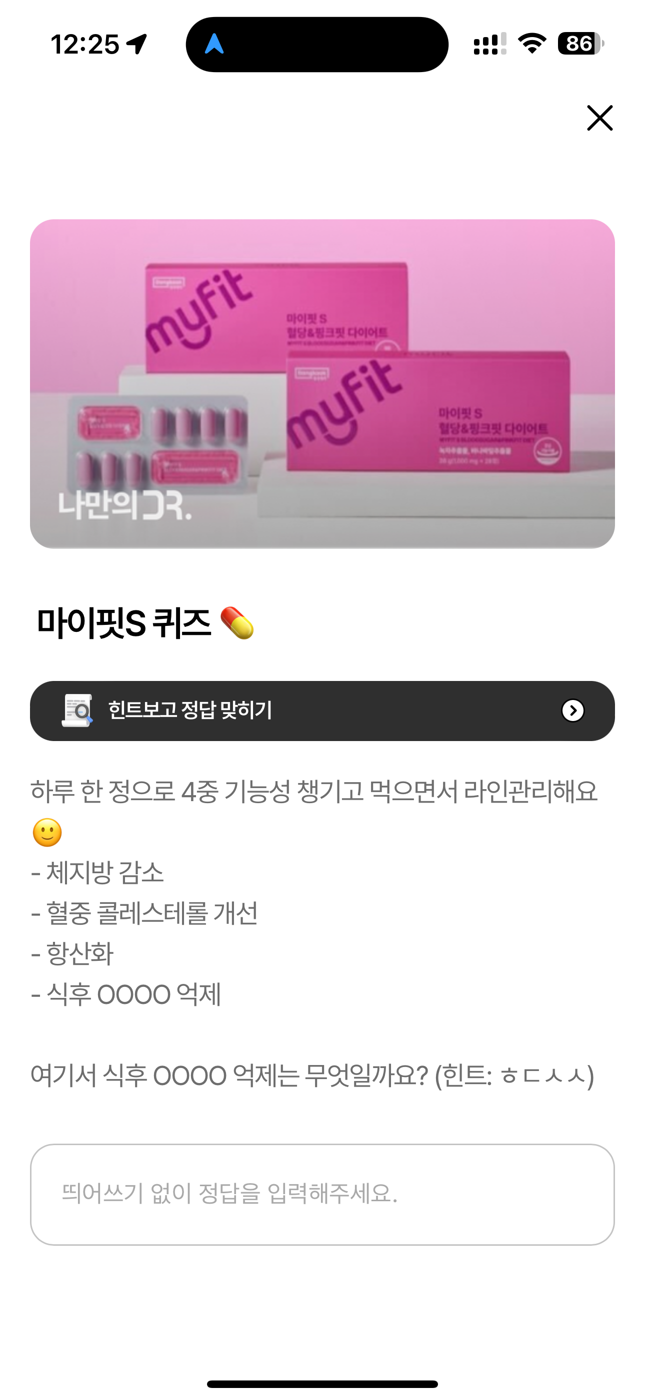 나만의닥터 마이핏S 퀴즈 하루 한 정으로 4중 기능성 챙기고 먹으면서 라인관리해요 - 체지방 감소 - 혈중 콜레스테롤 개선 - 항상화 - 식후 OOOO 억제 여기서 식후 OOOO 억제는 무엇일까요? 주관식 문제인데요.