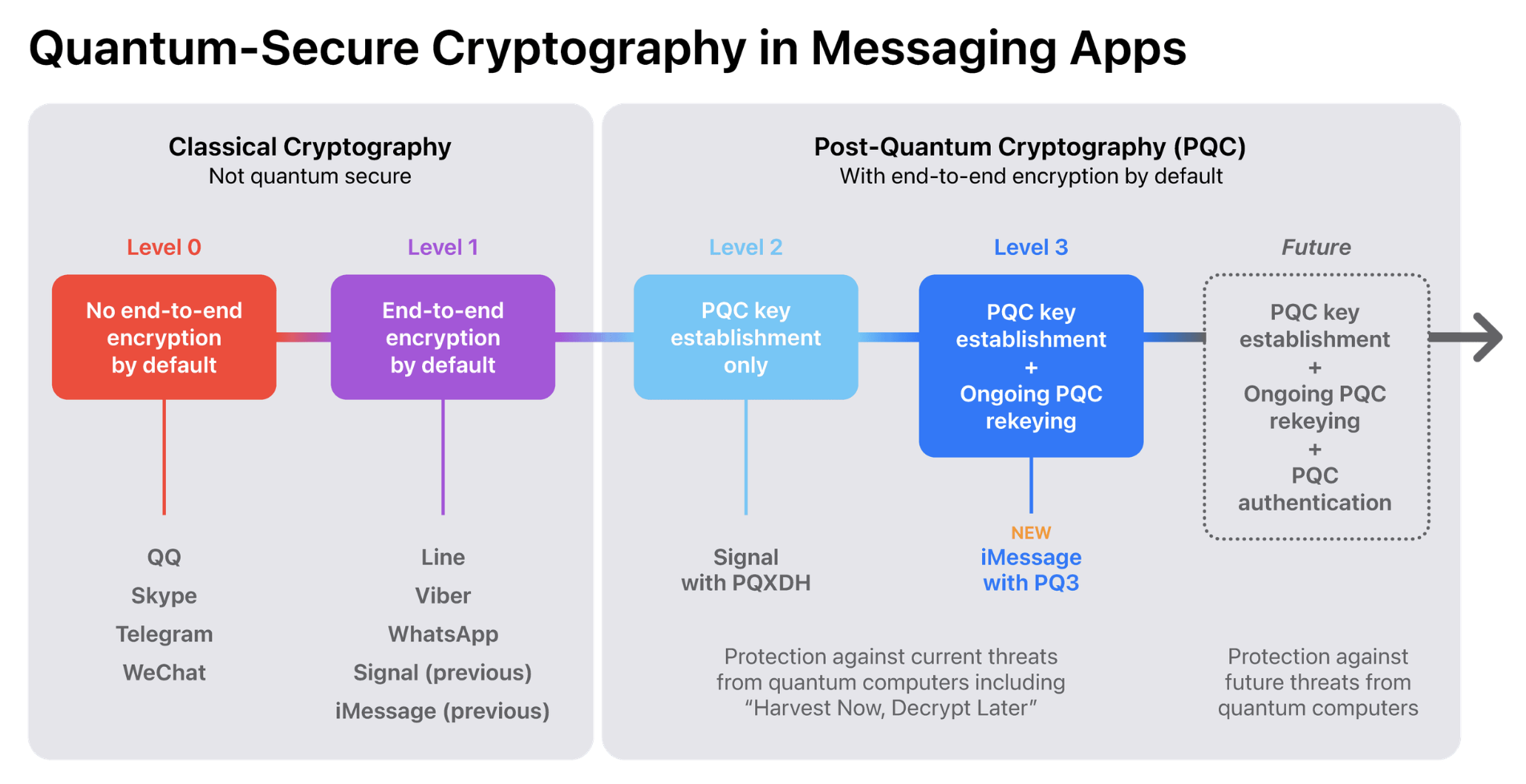 아이메시지 포스트 양자 암호화는 보안 단계로 보면 레벨3에 위치하고 있습니다. 손상 복원력이 뛰어난 암호화와 매우 정교한 양자 공격에 대한 광범위한 방어 기능을 갖추고 있습니다. 이는 최초의 메시징 프로토콜로 현재 전세계 모든 규모의 메시지 프로토콜 중 가장 강력한 보안 속성을 갖고 있습니다.