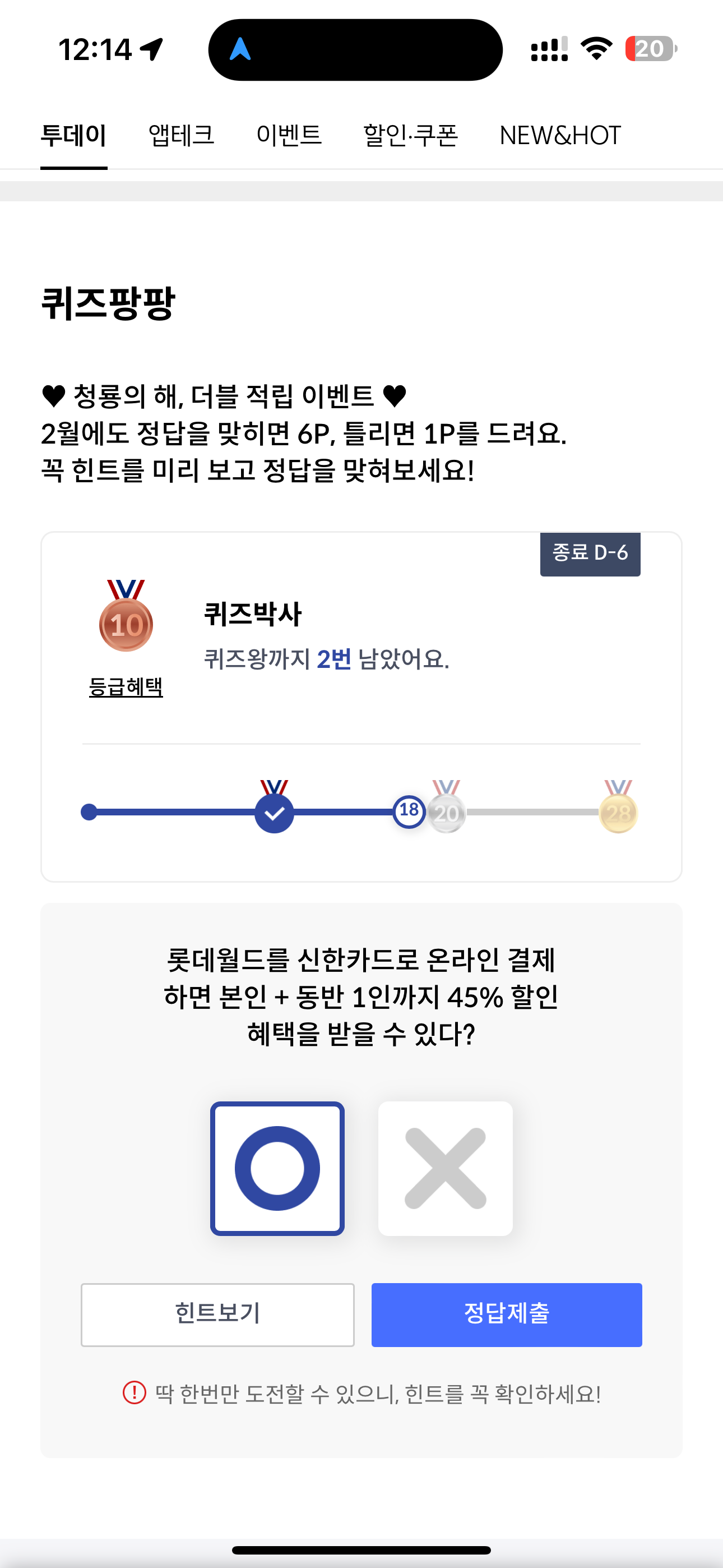 신한카드 퀴즈팡팡 2월 23일 정답(롯데월드를 신한카드로 온라인 결제하면 본인 + 동반 1인까지 45% 할인 혜택을 받을 수 있다?)