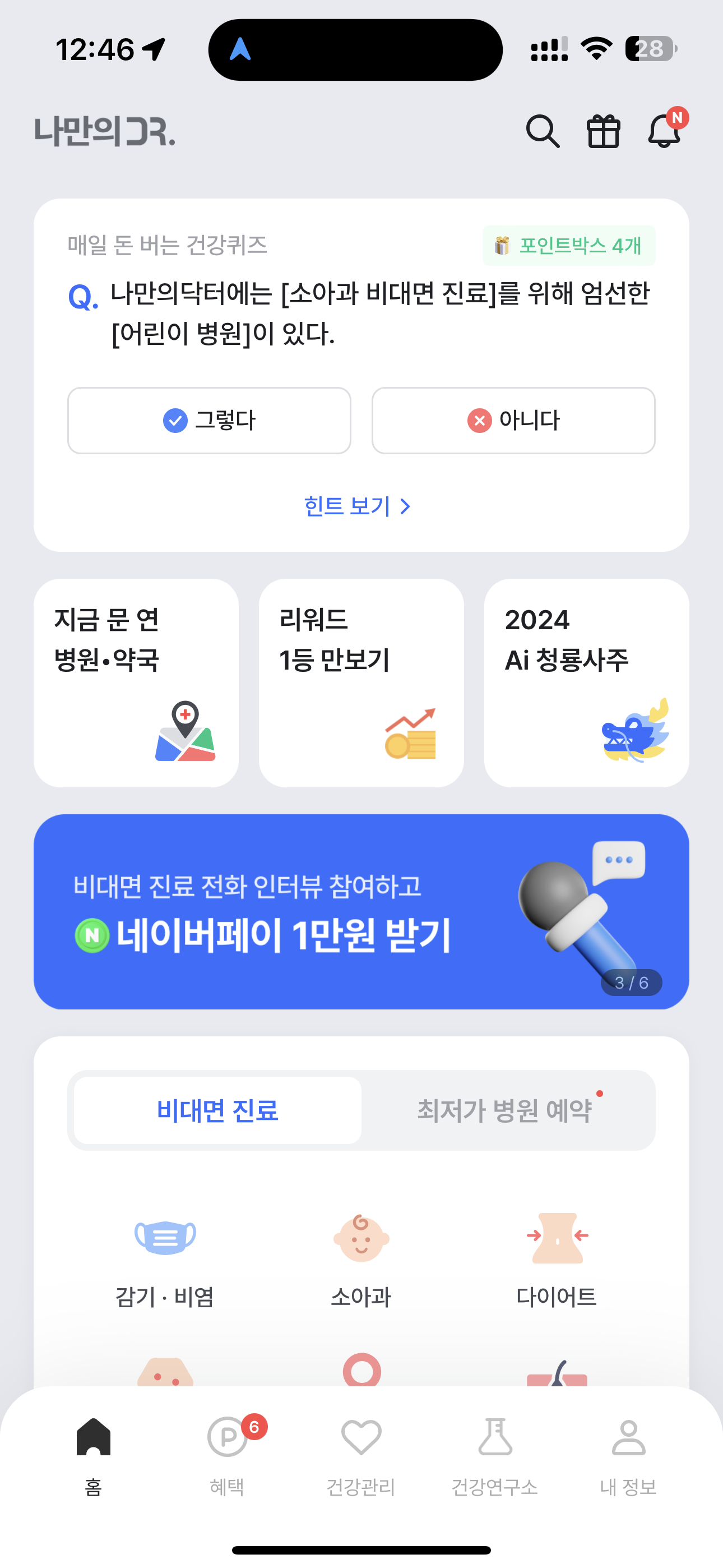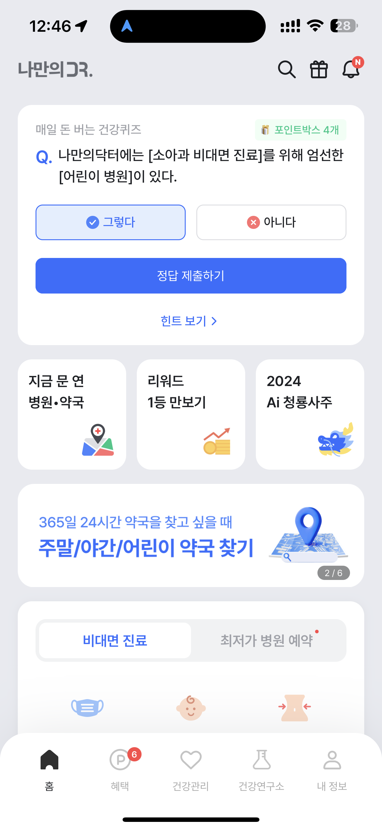 나만의닥터에는 [소아과 비대면 진료]를 위해 엄선한 [어린이 병원]이 있다. O, X 퀴즈인데요. 그렇다. 아니다 선택하시면 됩니다. 나만의 닥터는 다양한 서비스를 제공하는데 그와 관련된 문제입니다.