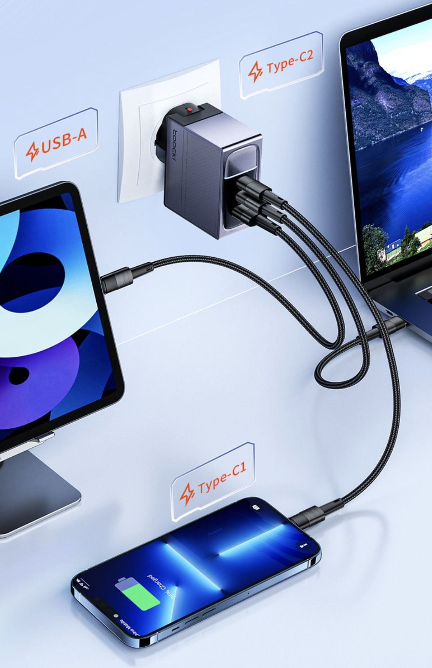 TOOCKI PD pps 100W 3포트 C타입 GaN 초고속 충전기는 케이블까지 포함되어 특가로 나오고 있으니 잘 참고해서 구매하시면 될 것 같습니다. 가성비 멀티 충전기 추천 모델입니다.