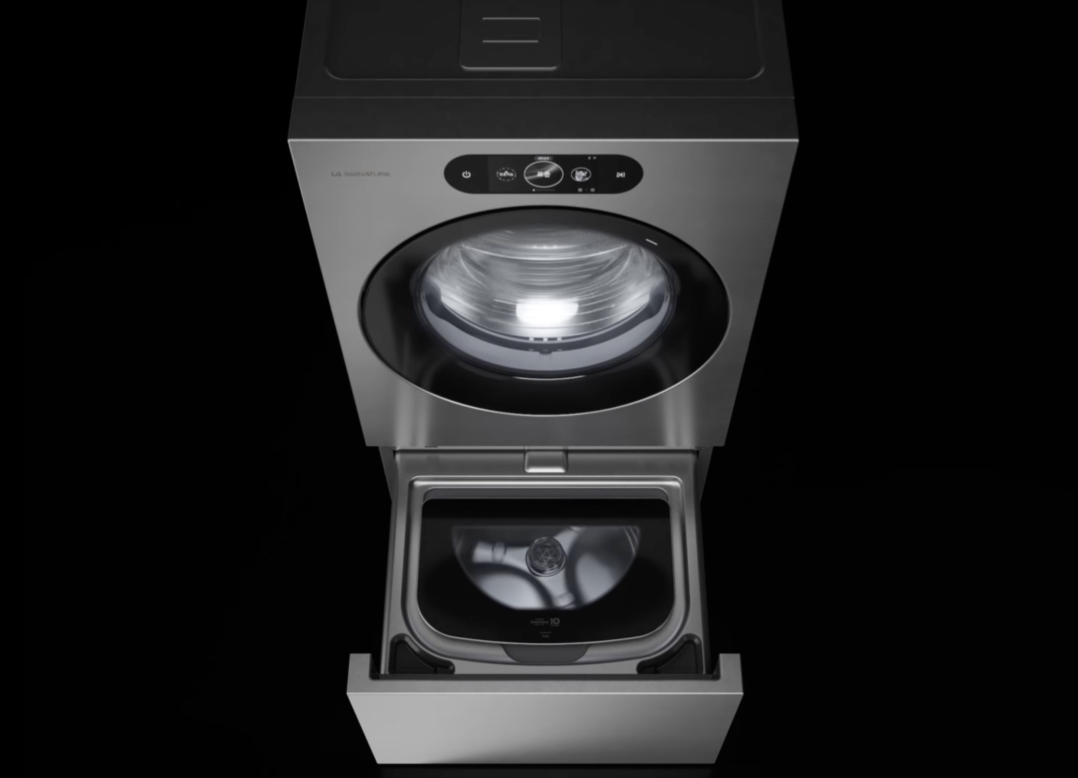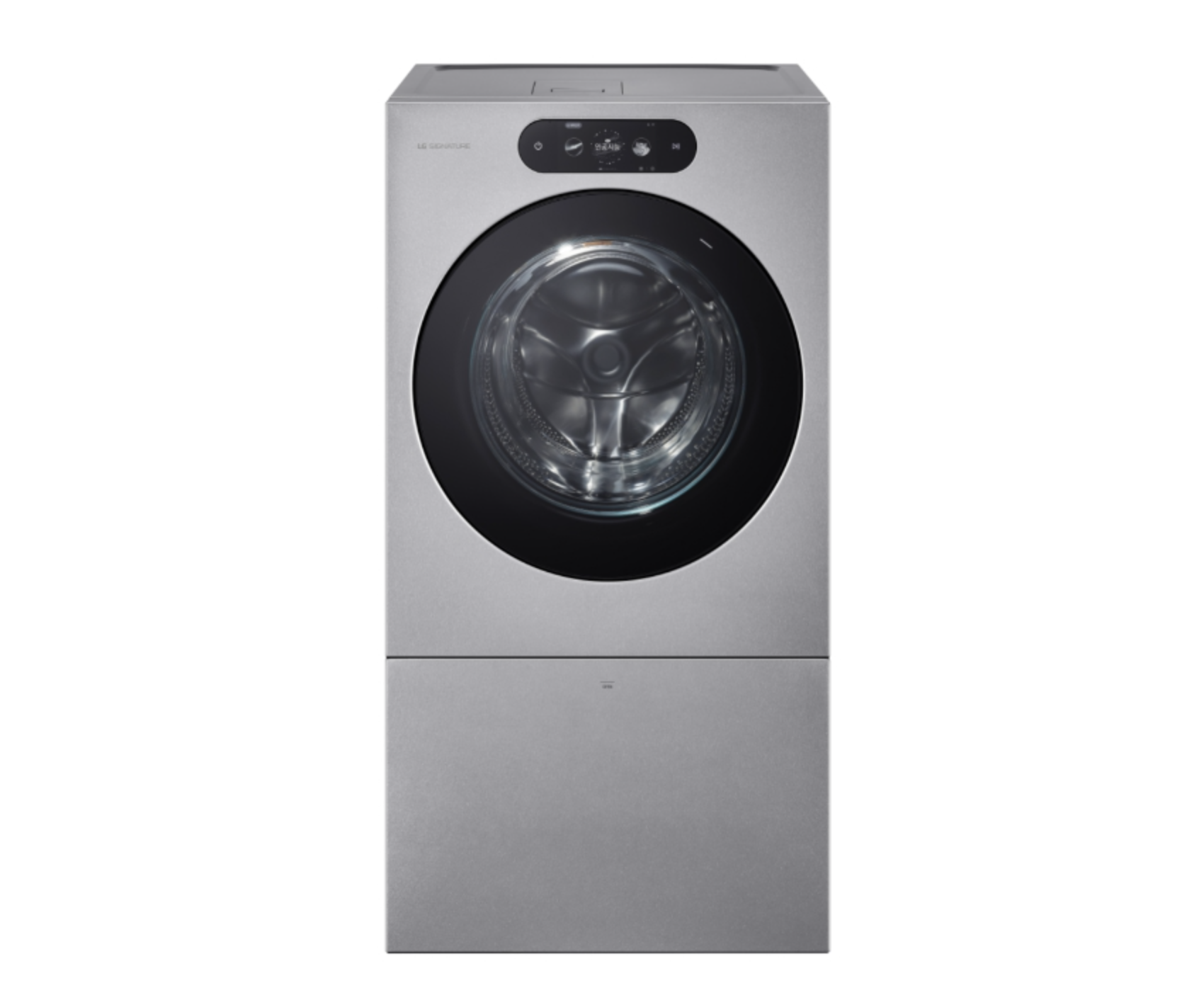 LG 시그니처 세탁건조기는 시그니처 라인답게 리얼 스테인리스 소재로 디자인 되었습니다. 그리고 전면에는 7인치 와이드 LCD 디스플레이가 있어 세탁기, 건조기, 미니워시까지 통합 제어를 할 수 있습니다.