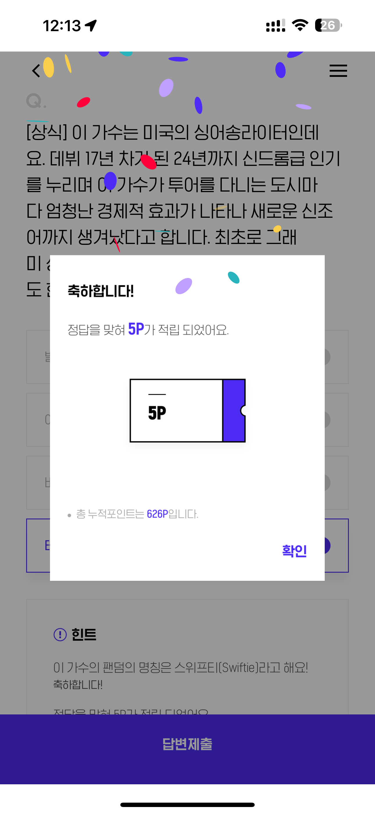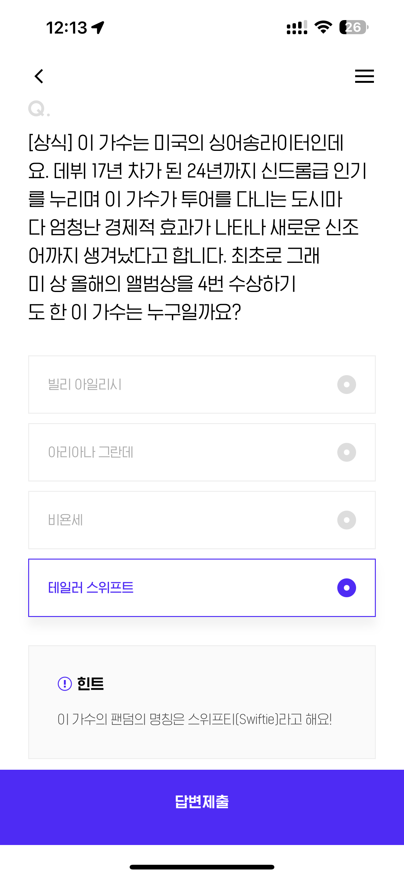 H포인트 퀴즈 정답은 테일러 스위프트 입니다