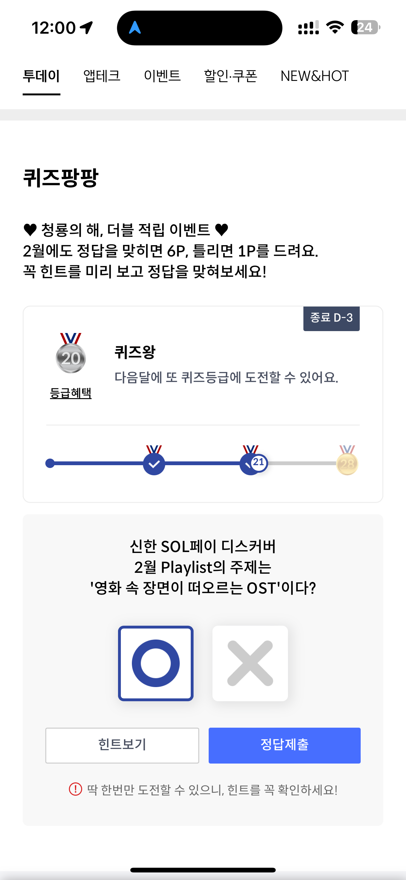 신한카드 퀴즈팡팡 정답은 O 입니다